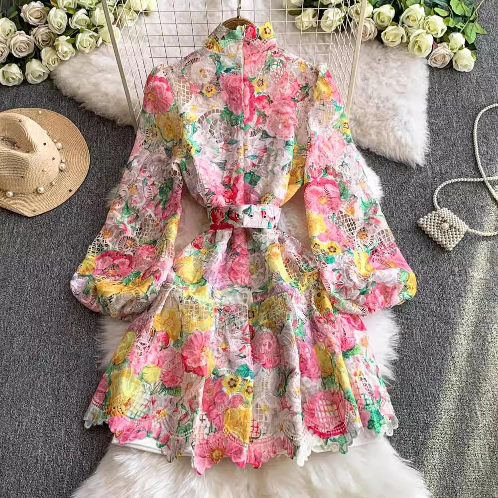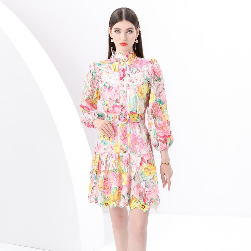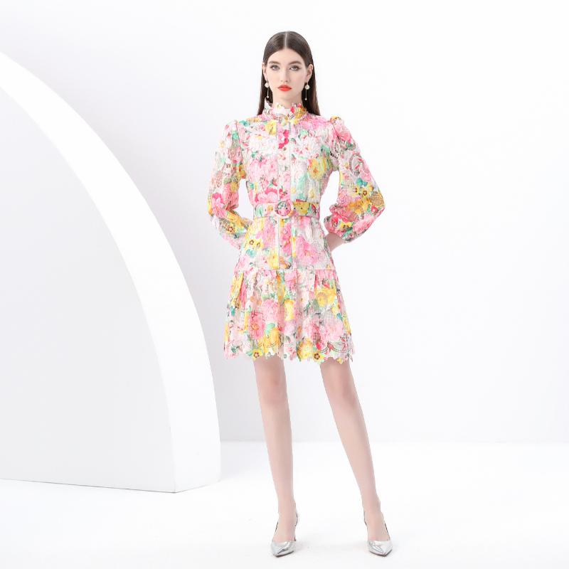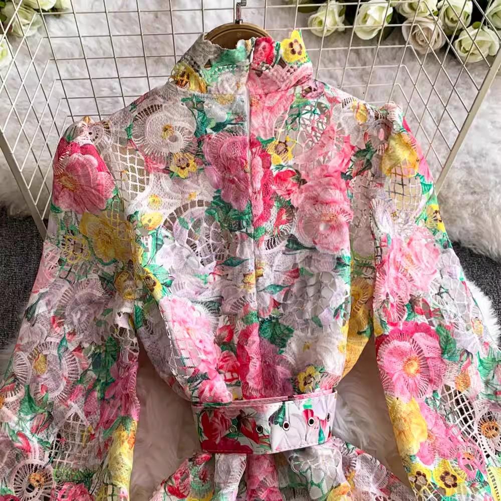 Весна Осень Женские стоячие воротник рукава-фонарика печати молния сзади водорастворимые кружевные вечерние платья с поясом