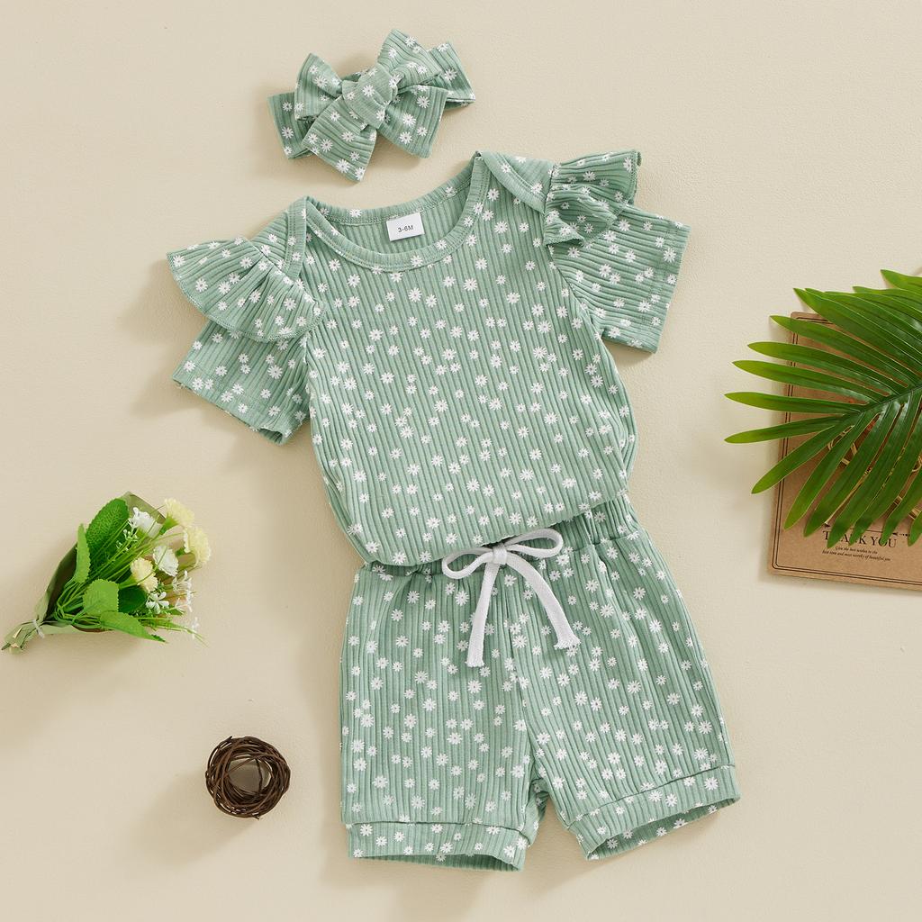Комплект из 3 предметов: шорты для маленьких девочек, цветочный принт, короткий рукав, комбинезон с шортами и повязкой на голову, летний комплект