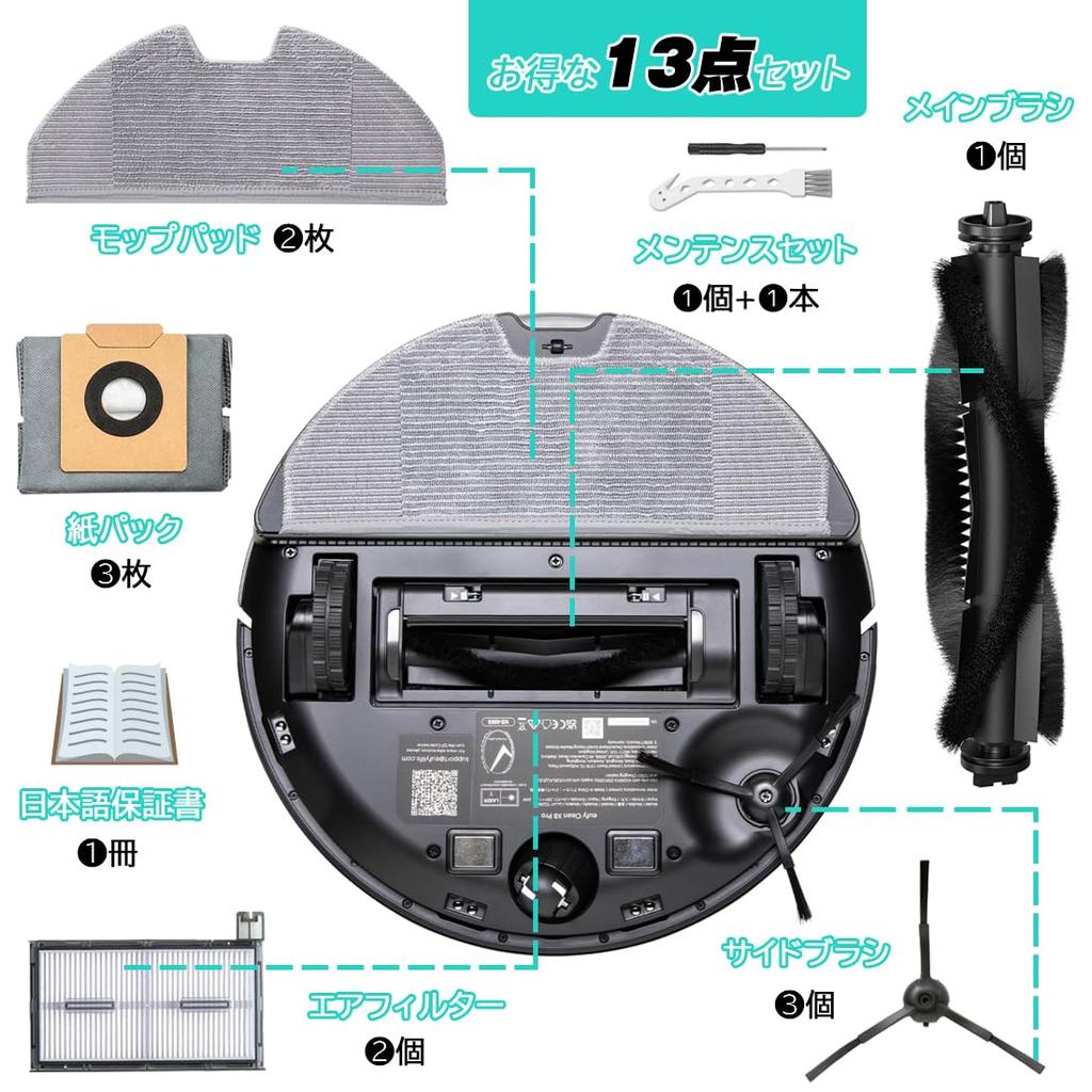 🌸 [Package contents] ❶ 1 main brush ❷ 2 mop pads ❸ 2 filters ❹ 3 side brushes ❺ 3 paper packs ❻ 1 maintenance brush + 1 cross screwdriver ❼ 1 Japanese warranty card (13 items in total)