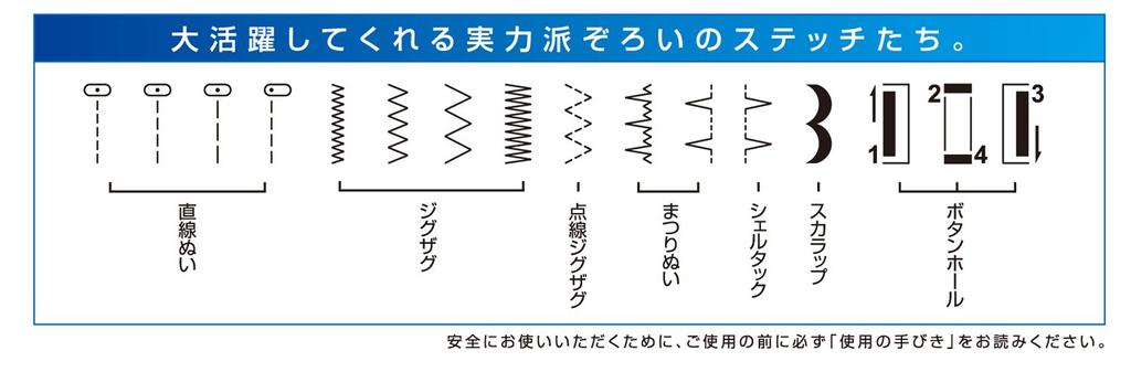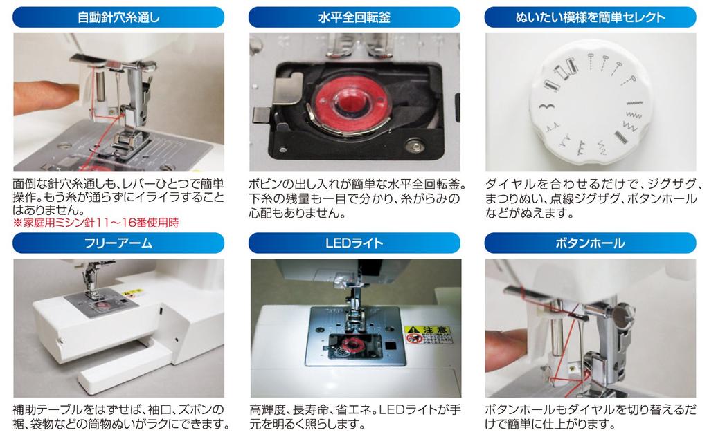 аксессуары: Педаль, лапка для зигзага, лапка для молнии, лапка для петли, лапка для пришивания пуговиц, отвертка, вспарыватель/щетка, набор игл, шпулька, направляющая для шва, прижим катушки с нитками (большой и маленький), вспомогательный катушечный стержень, держатель катушки с нитками, руководство по использованию, мягкий чехол