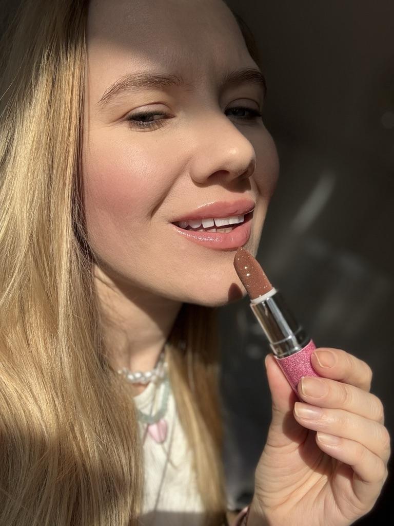 Помада💄красивая, 01 тон, сам столбик усыпан мелкими блёстками✨, очень красиво переливается на свету, на губах💋 их почти не видно, но мелкие вкрапления в перламутровом переливе присутствуют, значит, они не только сверху, но и во всём столбике💄, визуально эффект очень красивый.💄не стойкая, ложится мягко, на губах💋 ощущается приятно, тон 01 золотисто-бежевого💛 оттенка с перламутром, флакон красивый, можно брать на подарок🎁, без повреждений, продавцу спасибо🤗, в целом рекомендую к покупке🥰 Срок годности до 08.12.2027 Заказала сразу 01 и 03 тона, оба понравились