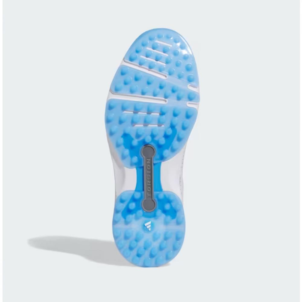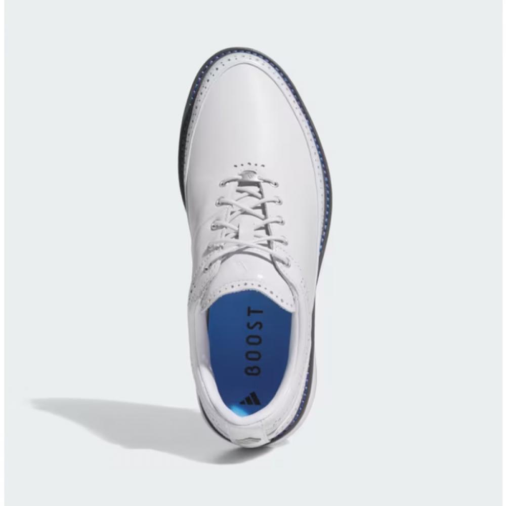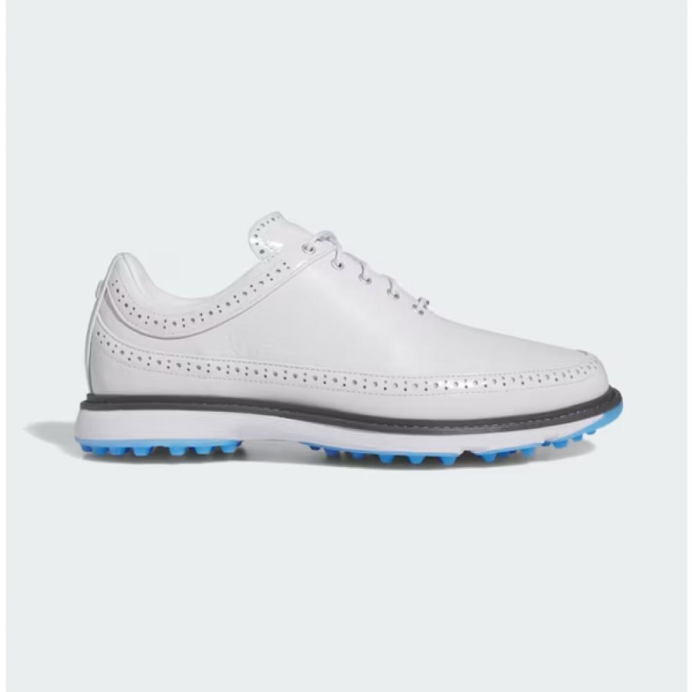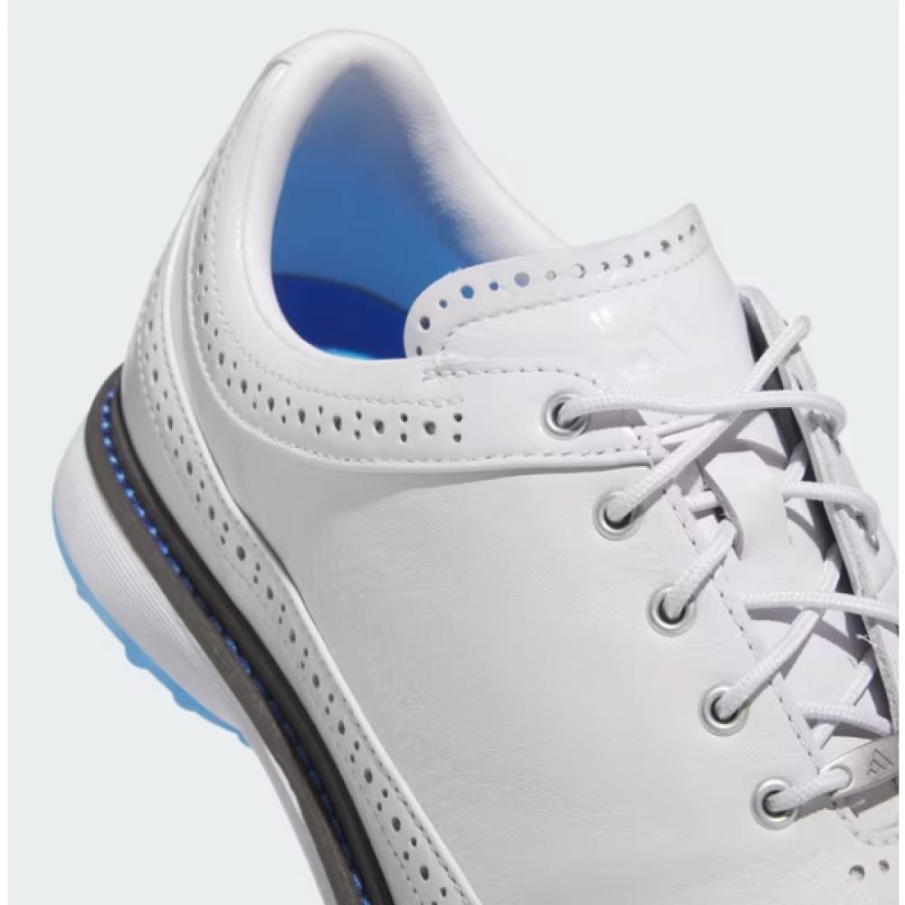 The Adidas Golf 24 SS Unisex Golf Shoes Modern Classic 80 Spikeless IF0322 is crafted with a full grain leather upper, offering outstanding durability and comfort. The sleek design showcases a combination of white and blue colors, while the spikeless design enhances grip and stability.