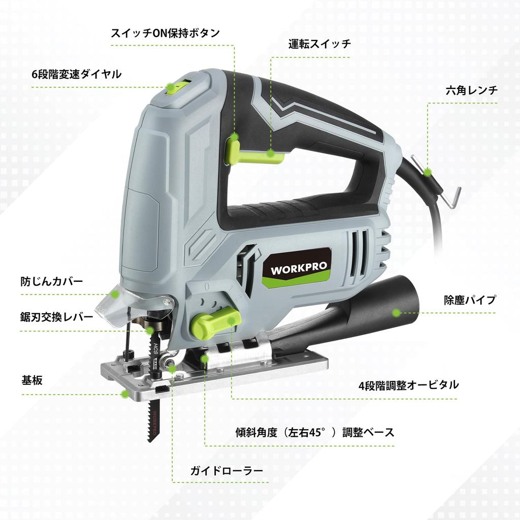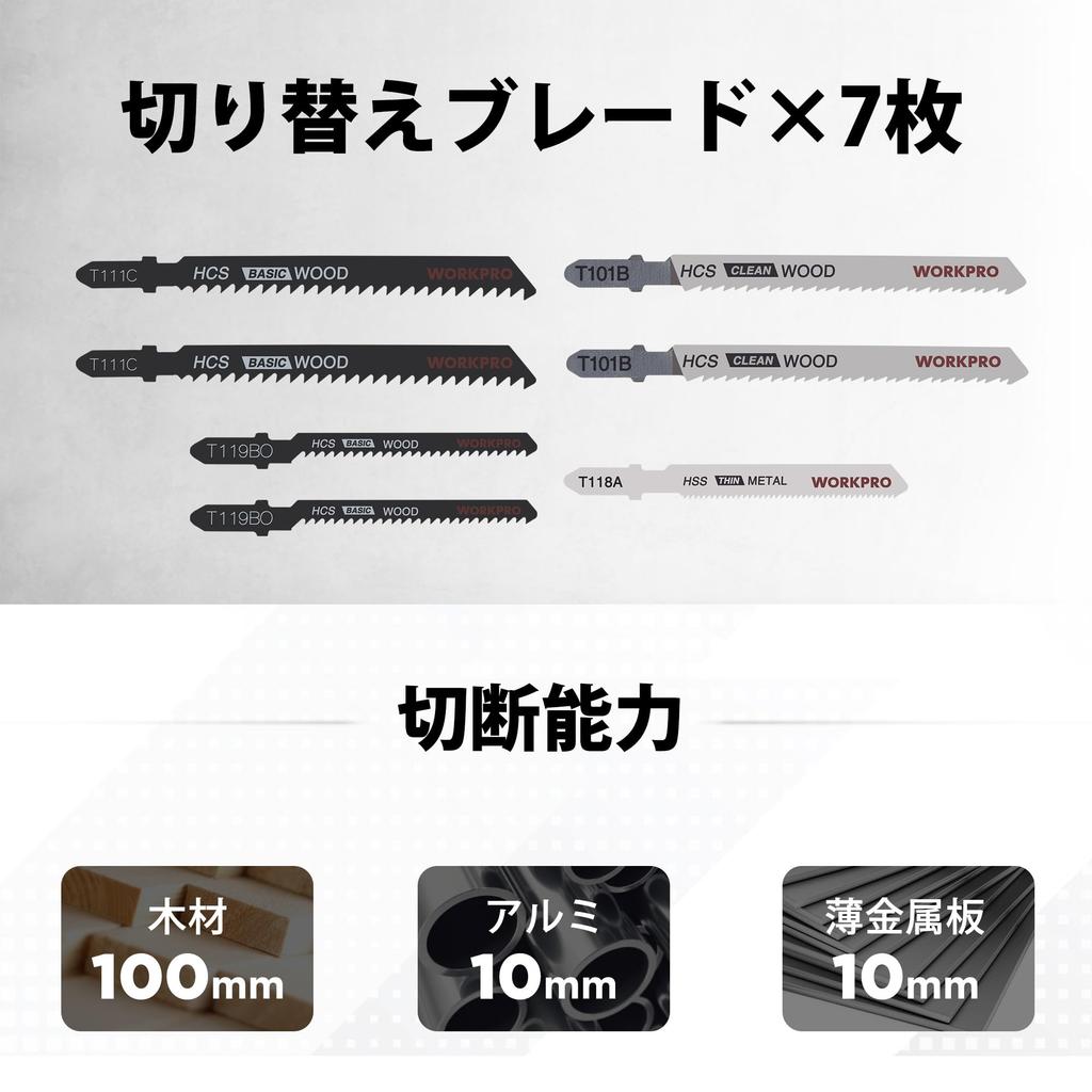 [Содержимое набора] Лобзик, 7 лезвий, металлическая направляющая линейка, шестигранный ключ, трубка для удаления пыли, инструкция на японском языке. ток: 6A. Потребляемая мощность: 600W. Число ходов: 800-3000мин-1. Ширина обводки: 17,4 мм. Максимальная режущая способность: дерево в пределах 100 мм, сталь в пределах 10 мм, алюминий в пределах 20 мм.