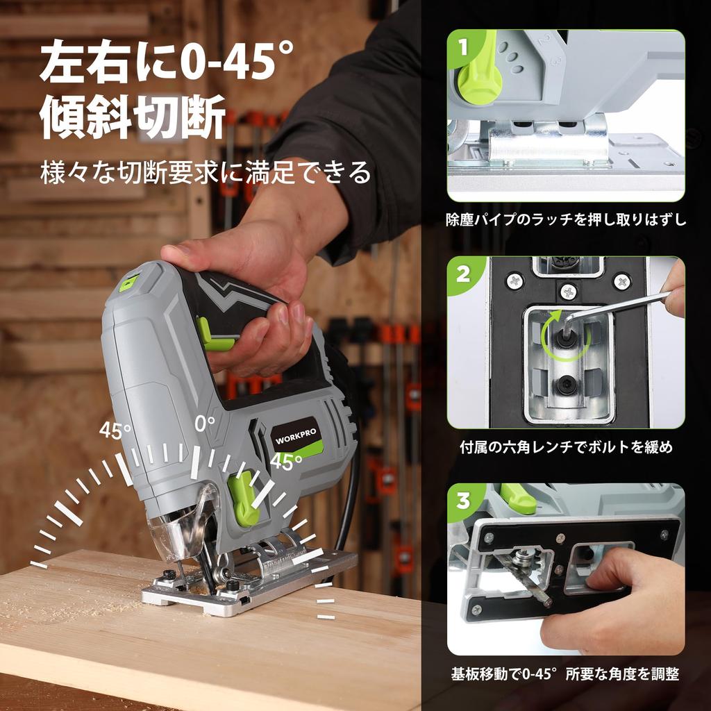 [Оснащен функциями воздуходувки и пылеулавливания] Воздуходувка сдувает стружку перед лезвием, что позволяет лучше видеть линии нанесения чернил для более точной резки, и может быть подключена к пылеуловителю сзади, что позволяет вам работать с комфортом, не беспокоясь о чистке.. Лобзики очень полезны в самых разных ситуациях, включая промышленные работы и домашние работы по дому.
