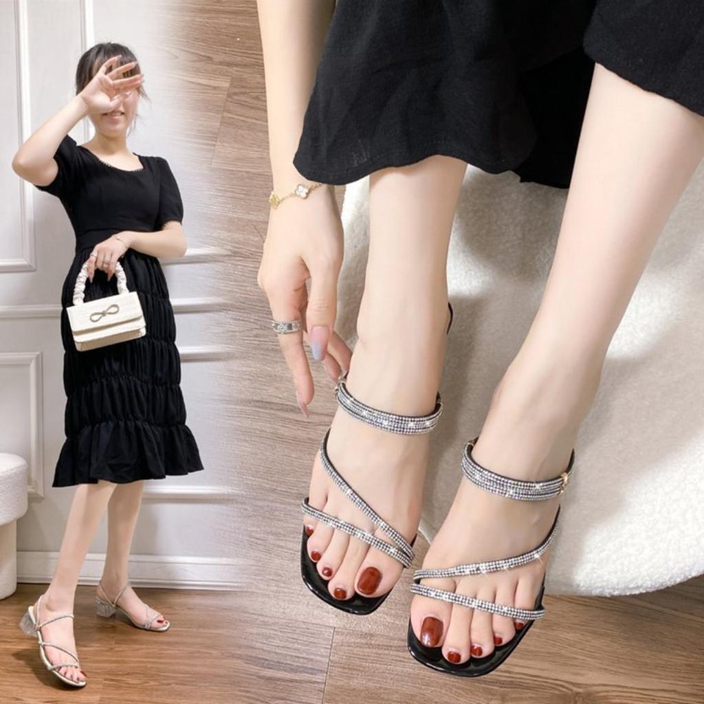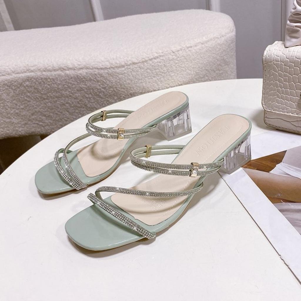Крутые тапочки со стразами на грубом каблуке. Женская обувь. Крутые тапочки с летним темпераментом.