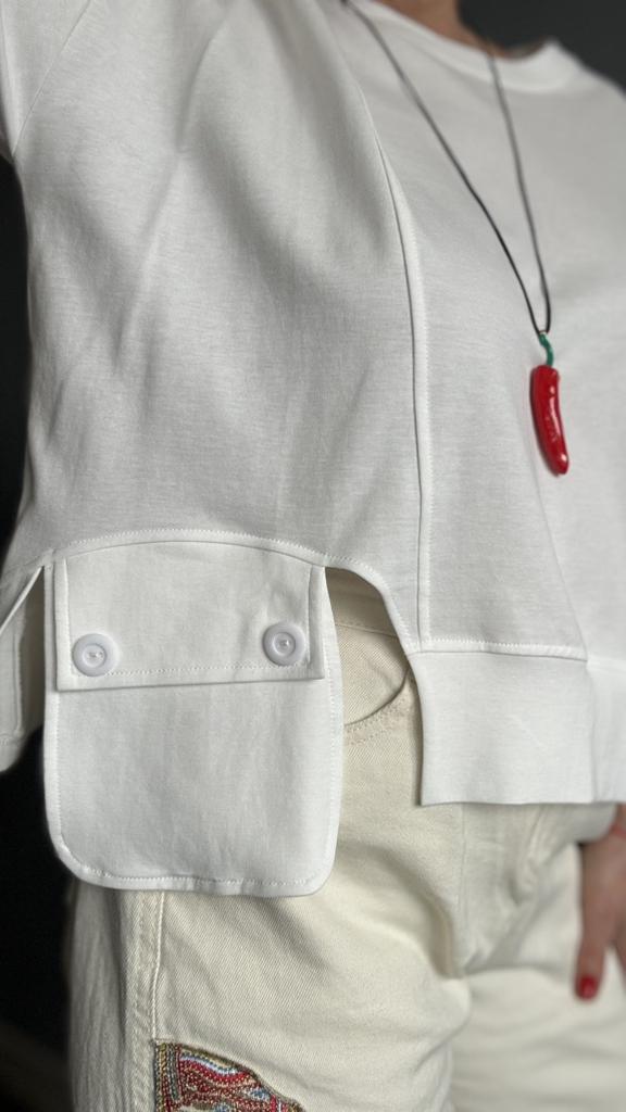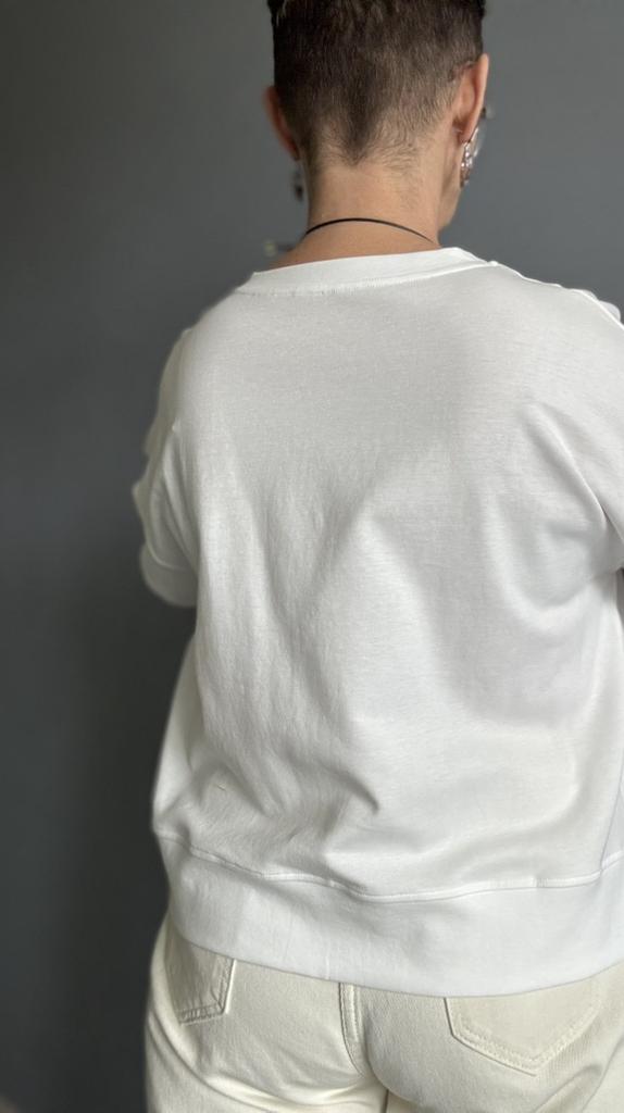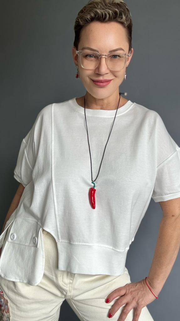 Белая футболка с висящим карманом ✔️Размер и цвет единый Мои параметры: 167, 98-85-100 ✔️Фасон: Плечи спущенные Силуэт прямой, к низу сужается Рукава широкие, с трикотажными манжетами В качестве декора: ложный карман с клапаном ✔️Ткань: Приятный, нежный, шелковистый, хлопковый трикотаж Тянется умеренно Пошив аккуратный, бирок и этикеток на моем экземпляре нет 📐Замеры: Плечи 61 Длина рукава 14 Длина рукава от горловины 35 ОГ подмышками 126 ОТ 122 ОБ 116 Ширина проймы 21 Длина 57