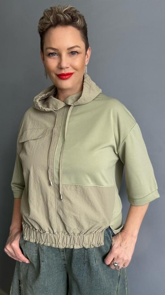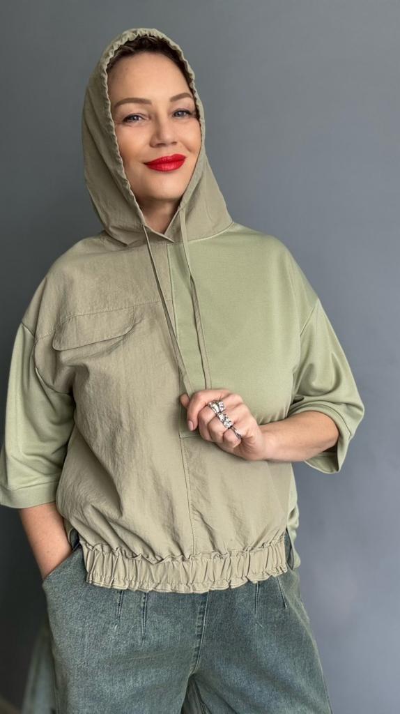 Красивая комбинированная из двух тканей футболка с капюшоном. Оригинально сшита. Передняя полка внизу на широкой резинке. Разрезы по швам. Довольна. Спасибо!