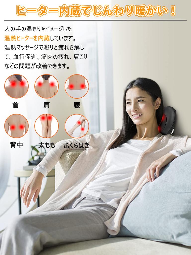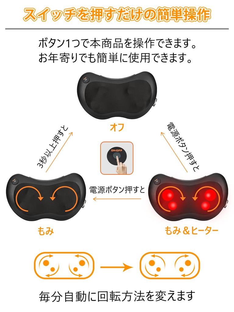[Еще комфортнее с обогревателем]: Направление вращения массажных шариков (вперед/назад) меняется автоматически каждую минуту. Оснащенный функцией подогрева, которая обеспечивает комфорт массажа, он массирует напряженные мышцы, одновременно согревая вас, а также комфортно массирует холодные участки, снимая ежедневную усталость.