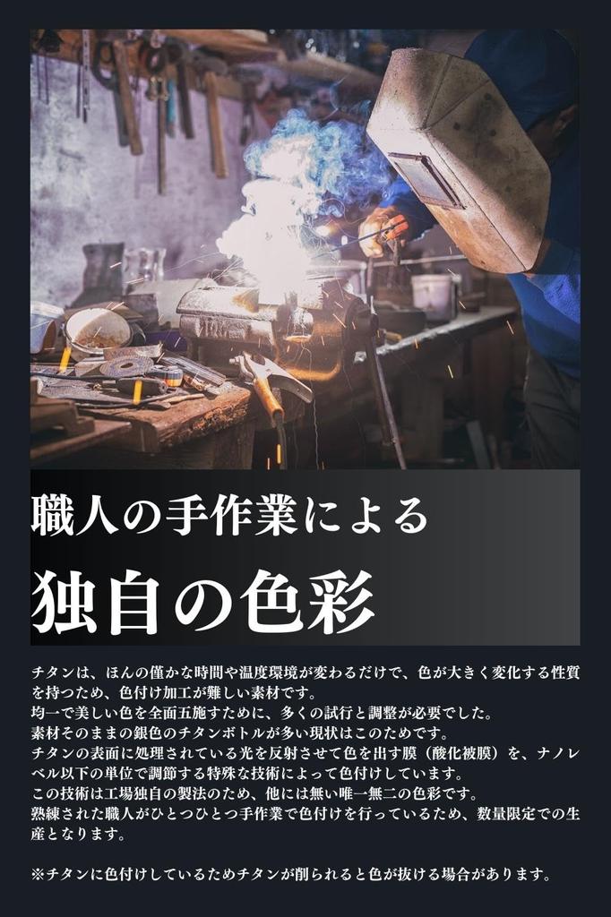 [Высокое мастерство] Титан — это материал, который трудно окрашивать, поскольку он имеет свойство резко менять свой цвет при небольшом изменении времени или температуры окружающей среды.. «Бутылка из чистого титана» окрашена с помощью специальной технологии, которая регулирует пленку (оксидированная пленка) на поверхности титана, который отражает свет и производит цвет на наноуровне или в меньших масштабах. Эта технология уникальна для завода, поэтому цвета уникальны.. Каждое изделие раскрашивается вручную опытными мастерами, поэтому они выпускаются в ограниченном количестве.. ●Поскольку сам титан окрашен, а не окрашен, он производится без использования химикатов.. Более того, поскольку он использует отражение света, внешний вид цветов меняется в зависимости от угла и местоположения.
