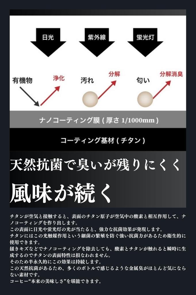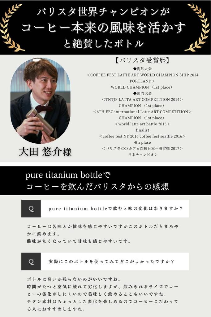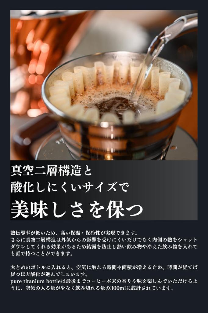 [В погоне за вкусностями] Титан — материал, который практически не имеет металлического запаха, который можно почувствовать у бутылок из нержавеющей стали.. Кроме того, изготовив носик из чистого титана, вы сможете наслаждаться оригинальным вкусом напитка, не отвлекаясь на привкус силикона.. ●Низкая теплопроводность обеспечивает высокую способность сохранять тепло и холод.. Кроме того, вакуумная двухслойная структура не только менее восприимчива к внешнему воздуху, но и имеет эффект изоляции тепла внутри, предотвращая образование конденсата и позволяя вам держать горячие или холодные напитки прямо внутри.. ● Тонкий носик для питья максимально раскрывает аромат и текстуру напитка.. ●Если вы поместите его в большую бутылку, время и площадь поверхности, на которую он будет воздействовать, увеличатся, поэтому чем больше времени пройдет, тем больше будет происходить окисление.. Бутылка из чистого титана вмещает всего 300 мл воздуха, что позволяет вам наслаждаться оригинальным ароматом и вкусом кофе до самого конца.・Способность сохранять тепло: Если поместить его в комнату с температурой около 28 градусов и наполнить напитком температурой 95 градусов, он будет оставаться теплым на уровне более 60 градусов в течение 6 часов.. Холодоудерживающая способность: Когда вы кладете 10-градусный напиток (без льда) при тех же условиях через 6 часов температура будет оставаться около 15 градусов. (По данным нашего исследования)