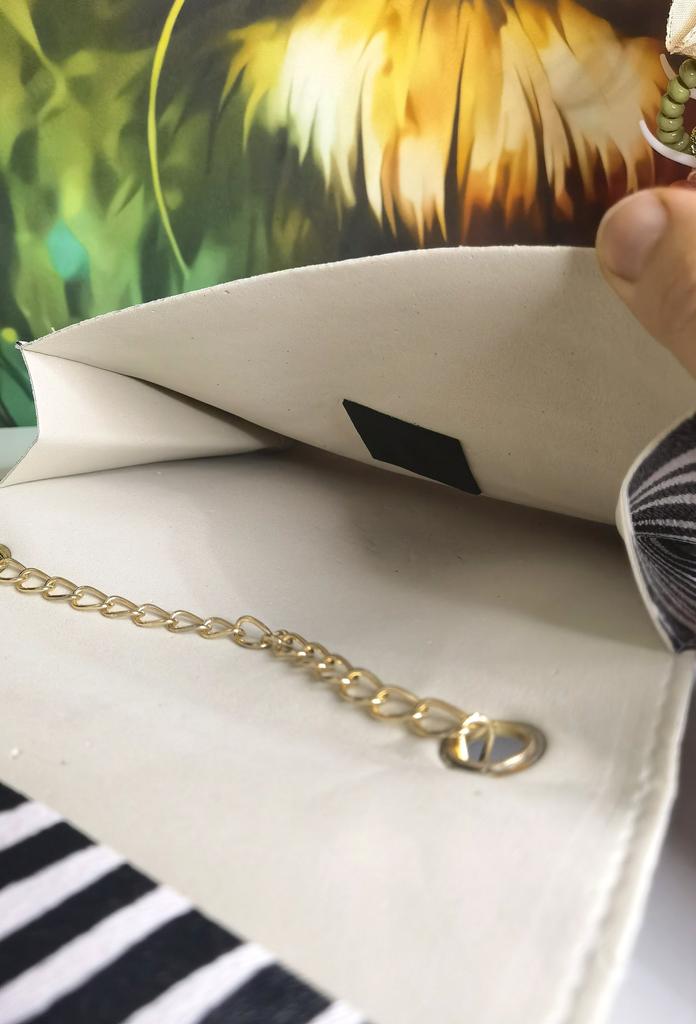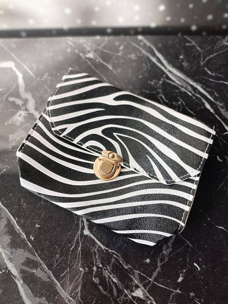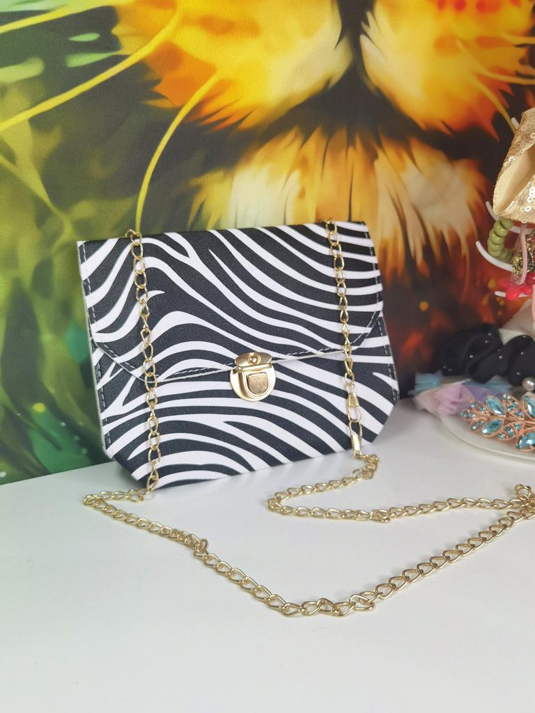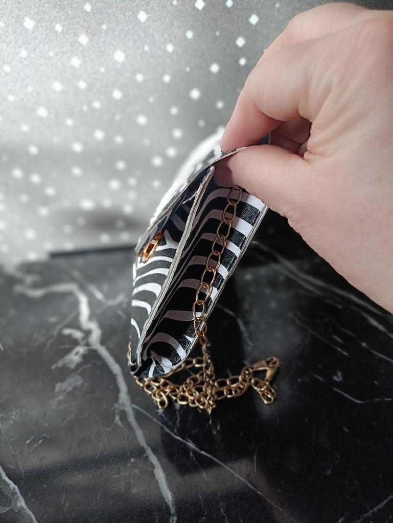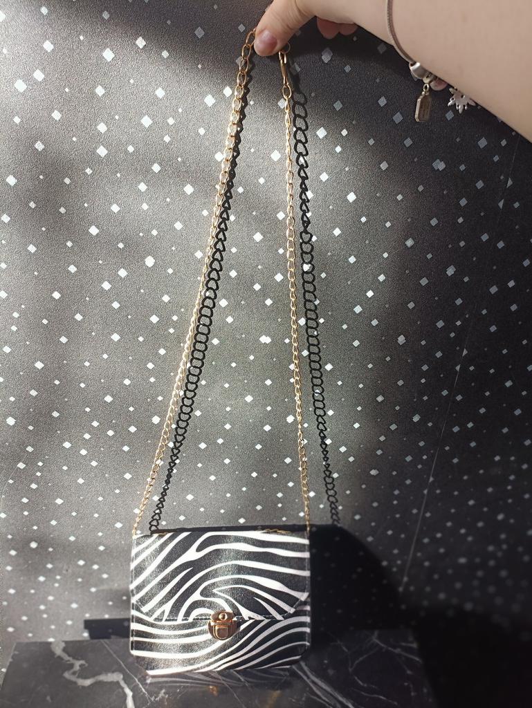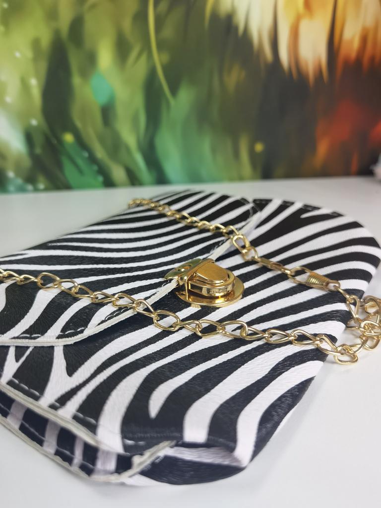 Удобная, симпатичная и очень бюджетная сумочка. Размер 20 х12 см. Помещаются все необходимые дамские мелочи. Цвет зачётный, зебровый. Очень неплохо смотрится. Сумочка застёгивается на замочек. Внутри одно отделение, без подкладки. Фурнитура симпатичного золотого цвета. Вместо ремешка-цепочка приятного золотистого цвета. Ее надо вставить в отверстия на сумке самой, на цепочке есть специальные карабинчики.