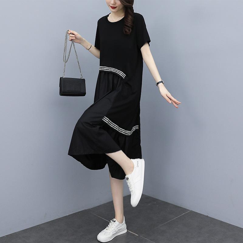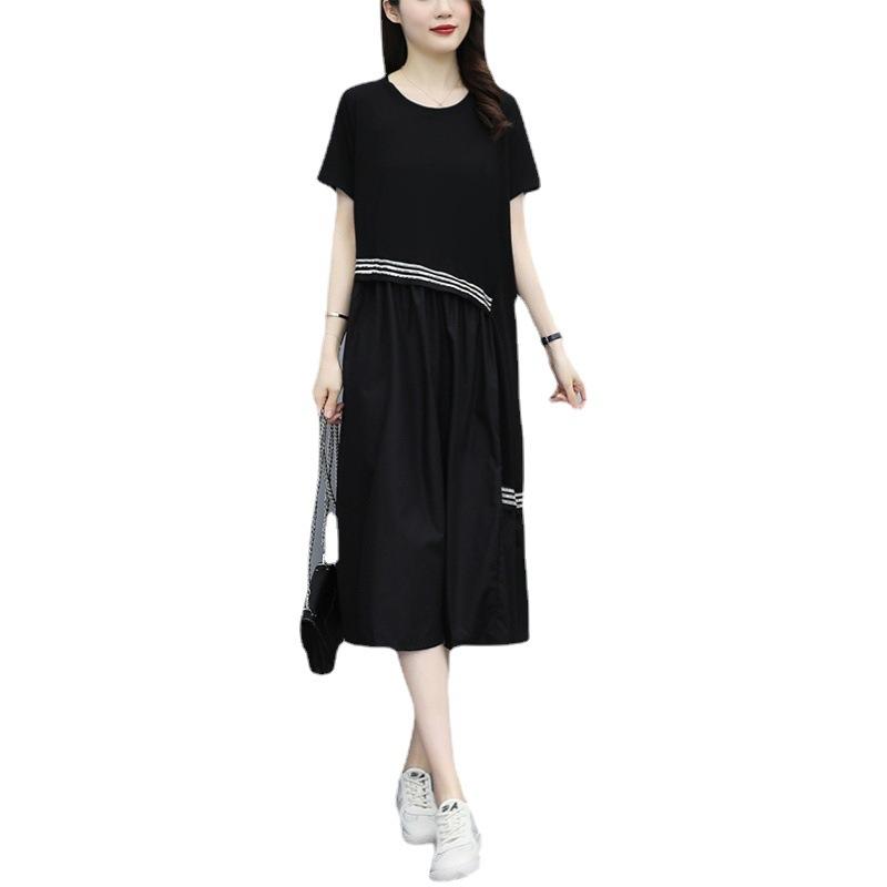 Платье средней и длинной длины выше колена, прикрывающее грудь, с короткими рукавами, а также укороченная свободная юбка-футболка большого размера в полоску.