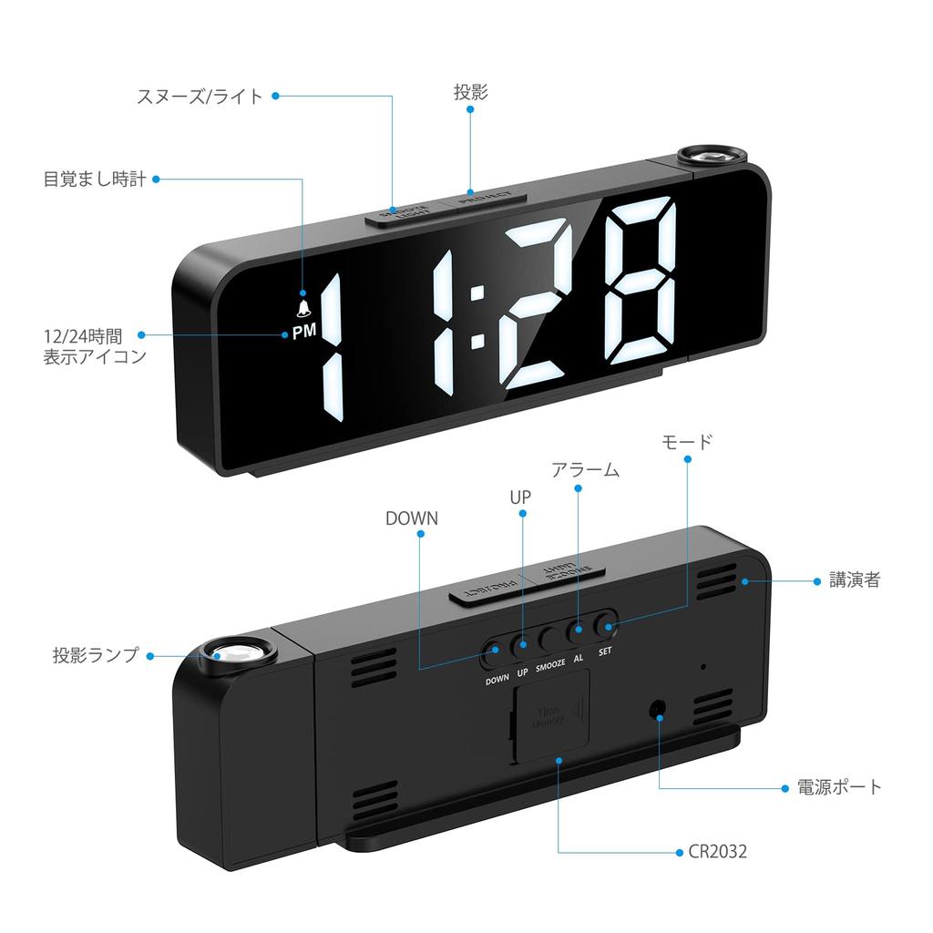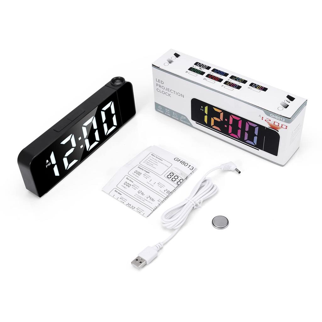 Функции кнопок /br/ Назад: УСТАНОВИТЬ, БУДИЛЬНИК, ОТЛОЖИТЬ, ВВЕРХ, ВНИЗ /br/ Верх: Кнопка SNOOZE/LIGHT PROJECT/br/SET: Нажатие кнопки SET в обычном режиме времени включает/выключает режим часов, режим даты, режим температуры и ночной режим.. ВВЕРХ/ВНИЗ завершает настройку /br/ Кнопка ALARM: Нажмите один раз, чтобы отобразить время будильника, нажмите еще раз, чтобы открыть будильник и отобразить соответствующий будильник, нажмите еще раз, чтобы закрыть будильник и выключить будильник. Длительное нажатие в течение 3 секунд перейдет в режим настройки, после входа отобразятся его элементы настройки, мигающие в следующем порядке: «Настройка часов → Настройка минут → Время повтора — выбор будильника на будний день». (1-7/1-6/1-5)" /br/ Кнопка проекта: В стандартном режиме нажмите кнопку Project один раз, чтобы включить проекционный свет, нажмите еще раз, чтобы опустить проекционный свет, нажмите еще раз, чтобы выключить функцию проецирования.. /br/ Описание функции /br/ Установка времени: Нажмите и удерживайте кнопку SET, чтобы войти в режим настройки, и используйте кнопки ВВЕРХ, ВНИЗ, чтобы изменить порядок настройки на 12/24 часа-часы-минуты.