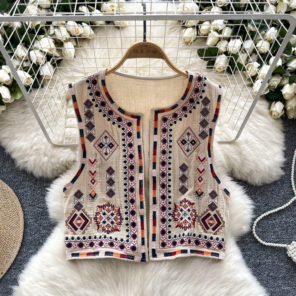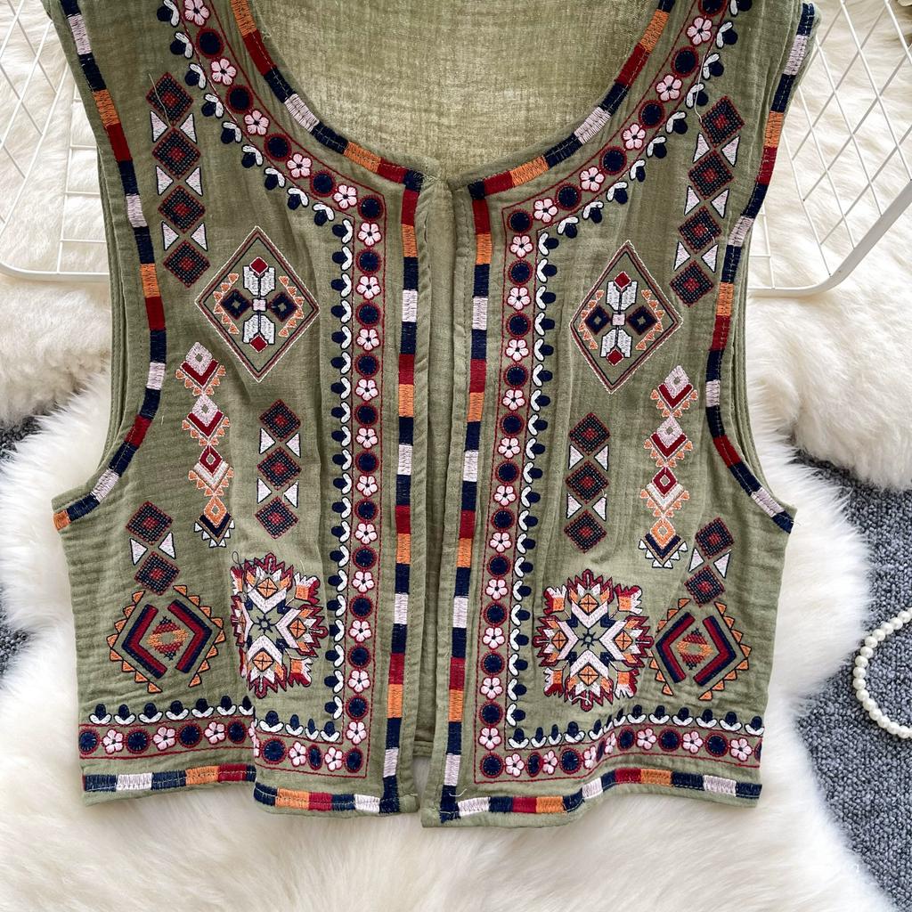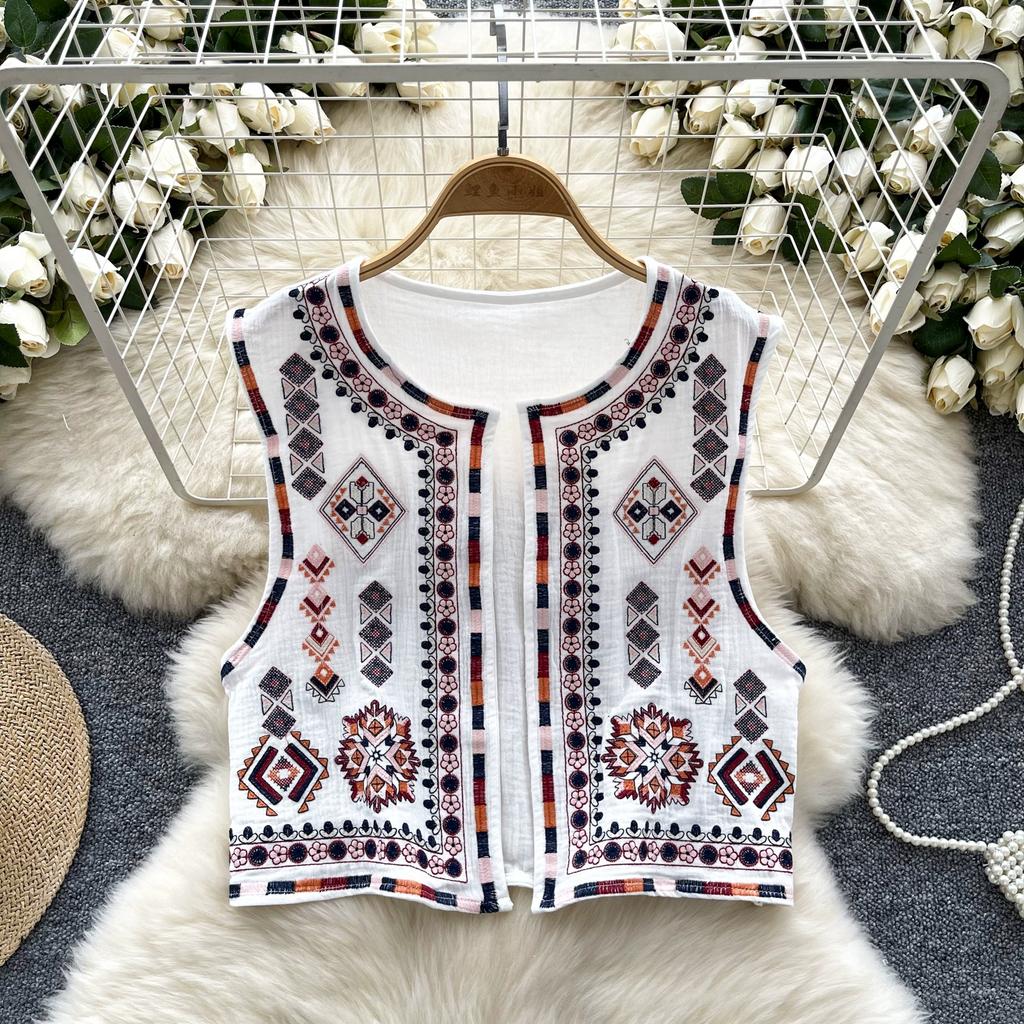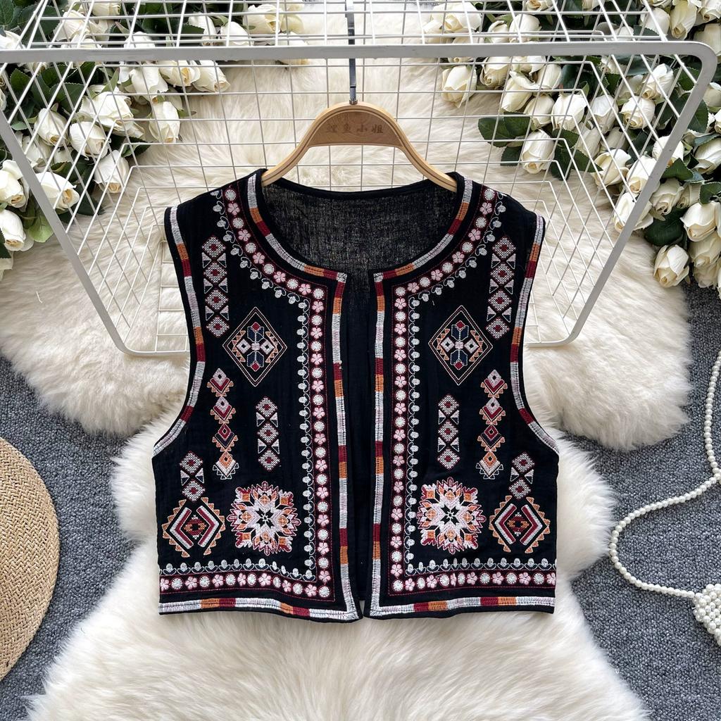 Новый национальный стиль цветочный кардиган жилет женский модный вышитый укороченный жилет винтажный О-образный вырез без рукавов женская верхняя одежда шикарный жилет топы