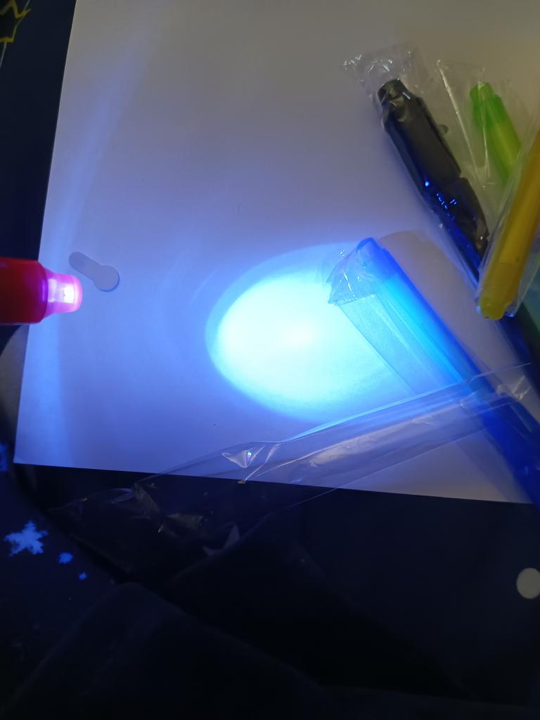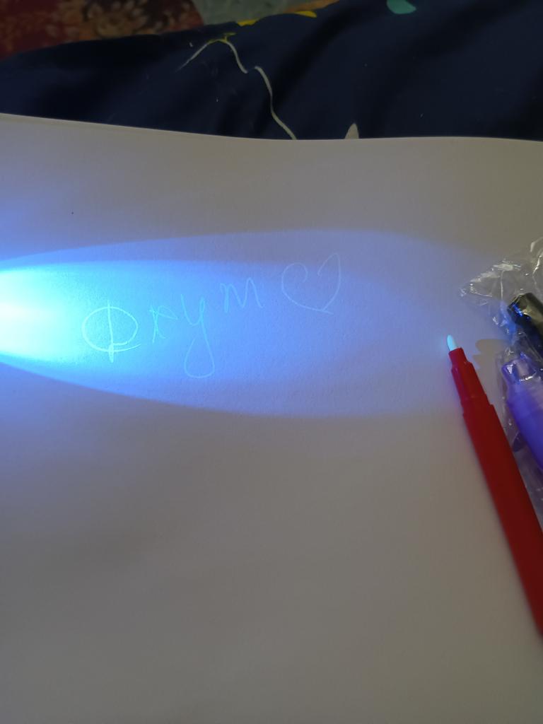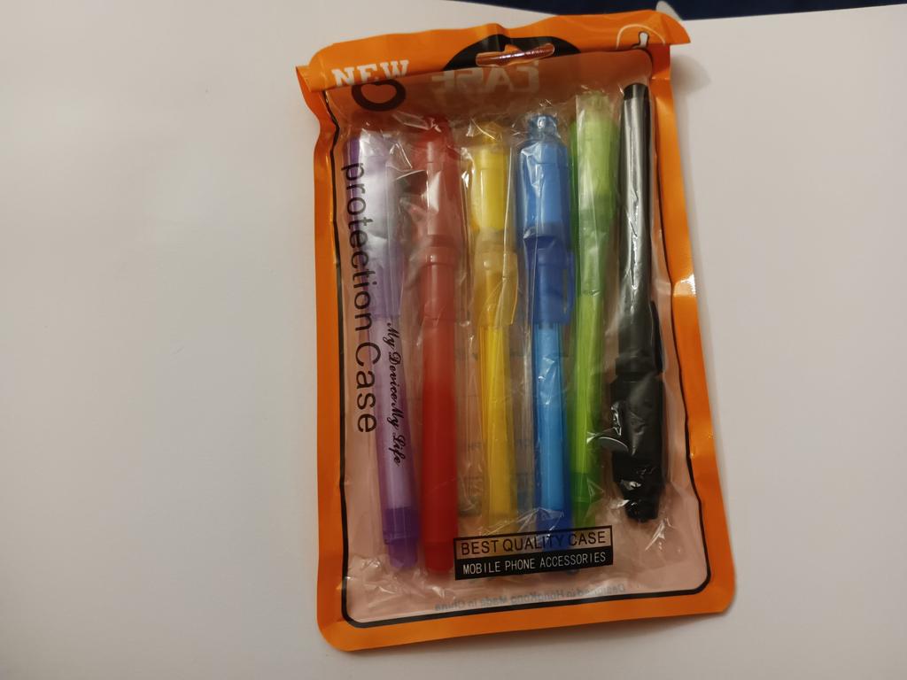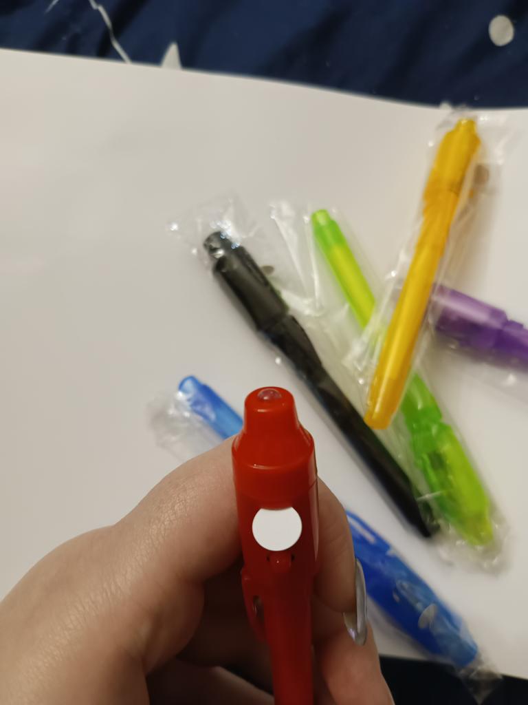 Ручки пришли в странном пакете из-под защитного чехла, но это мелочи. Упаковка с пупыркой, всё пришло в целости и сохранности. На каждой ручке есть фонарик с УФ. Чтобы его активировать, нужно снять защитную бумажку и нажать на кнопку. Потом колпачок с фонариком можно снять и уже попробовать что-нибудь написать. Чернила проявляются под УФ, с обычным освещением, даже под ярким фонарём, ничего не заметно. Удобно, что каждая ручка в индивидуальной упаковке
