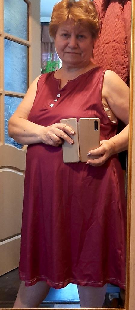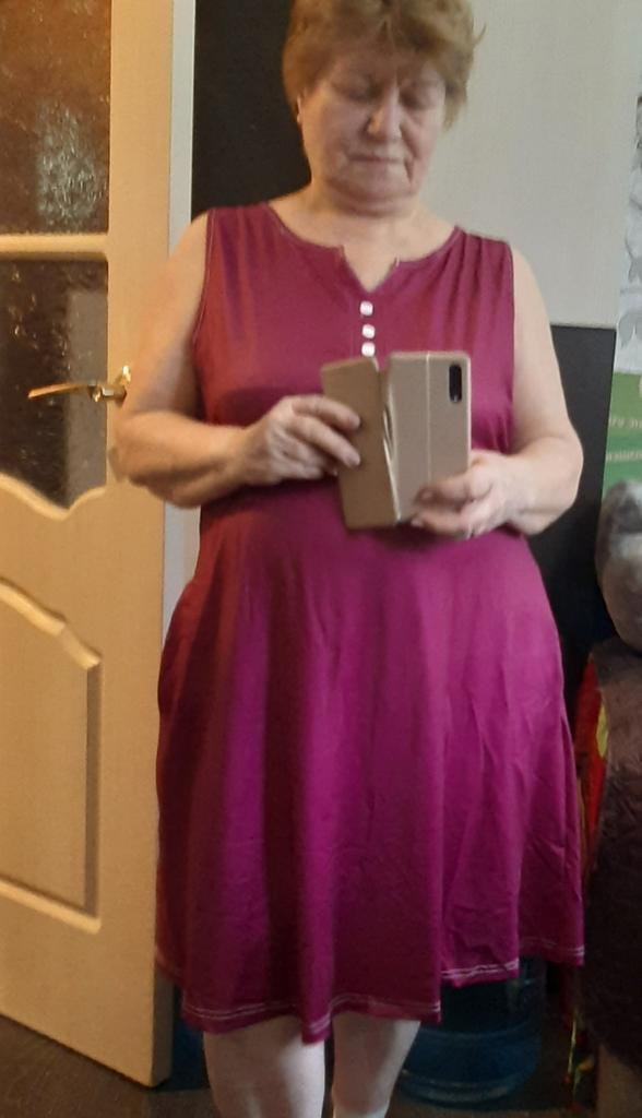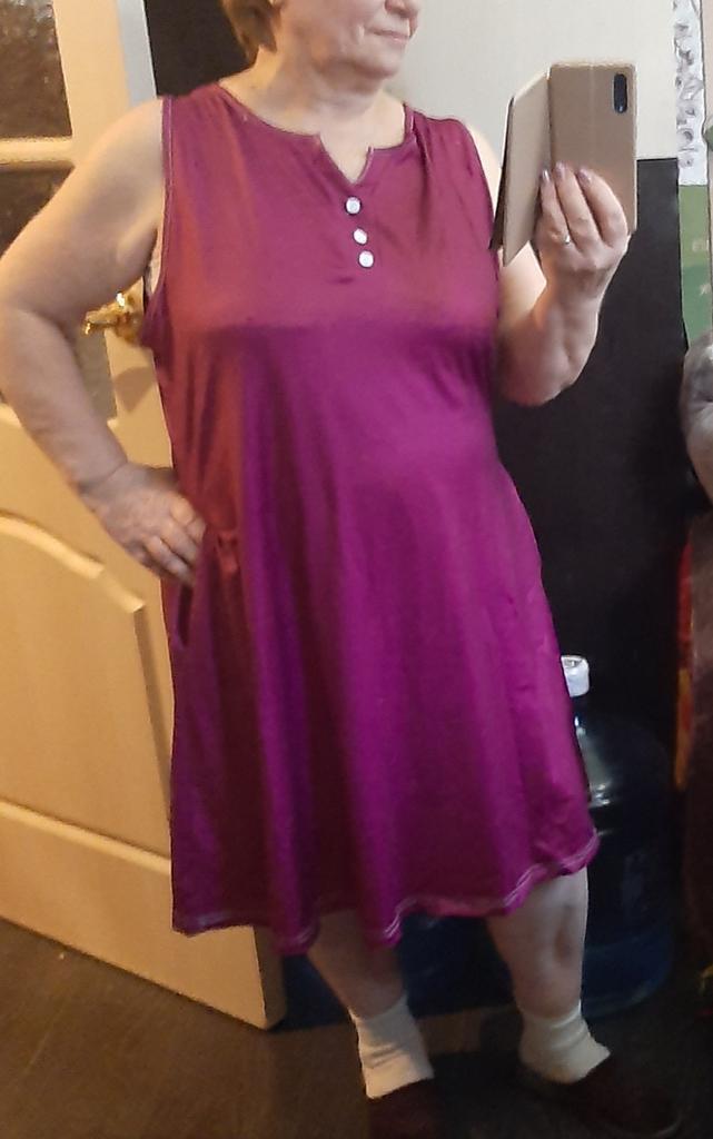 Мои мерки - ОГ103, ОБ114. Обычно 2XL брала на свой 52 размер, но это платье на два размера больше, т.е. по таблице указанные размеры не подходят для XXL. Обязательно смотрите таблицу! Пошив на 3+, швы стянуты, нитки кругом торчат. Материал похож на бельевой трикотаж. Придётся ушить по проймам по 5см. Если взять XL или L, по груди будет нормально, но по бёдрам тесновато, т.к. расчёт был на расклёш, но клёш маленький, больше на трапецию похоже, тем более, карманы в боковых швах. Если бы видела в натуре, не купила бы.