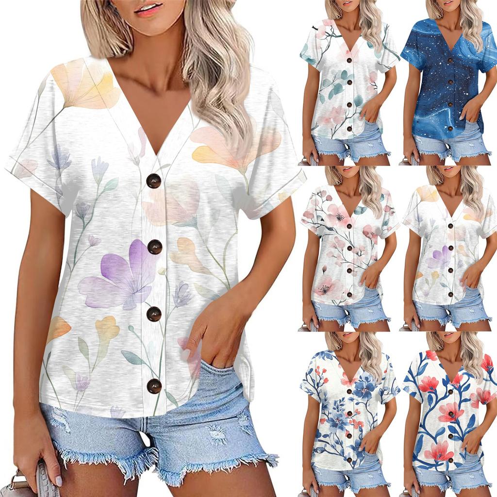 Женская мода с короткими рукавами и V-образным вырезом, повседневная футболка с пуговицами — купить товар онлайн с бесплатной доставкой по всему миру!