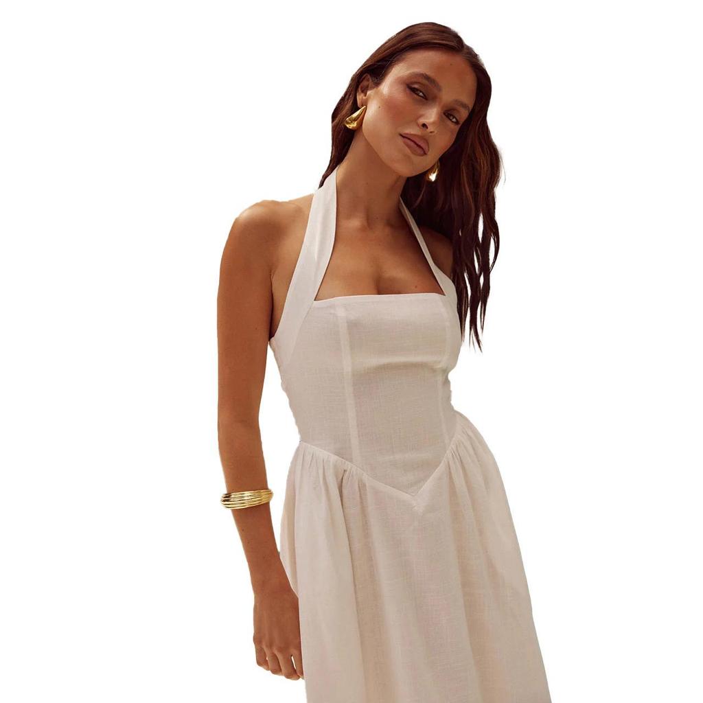 Женское весеннее платье без рукавов на бретельках с завязками на шее, летнее повседневное платье длиной до щиколотки с открытой спиной и высокой талией, карманные платья, размеры S-XL