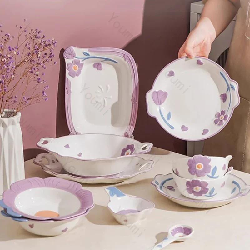 Креативные рельефные цветы Керамические тарелки Роскошные ресторанные салатницы Десертные тарелки Вкусные блюда Супницы Изысканная столовая посуда
