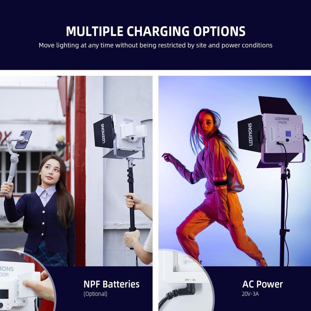 Два типа методов электропитания: Помимо источника постоянного тока для панельной лампы LP, LP600R может использовать батареи NPF, что обеспечивает как стабильность, так и гибкость в диапазоне электропитания.