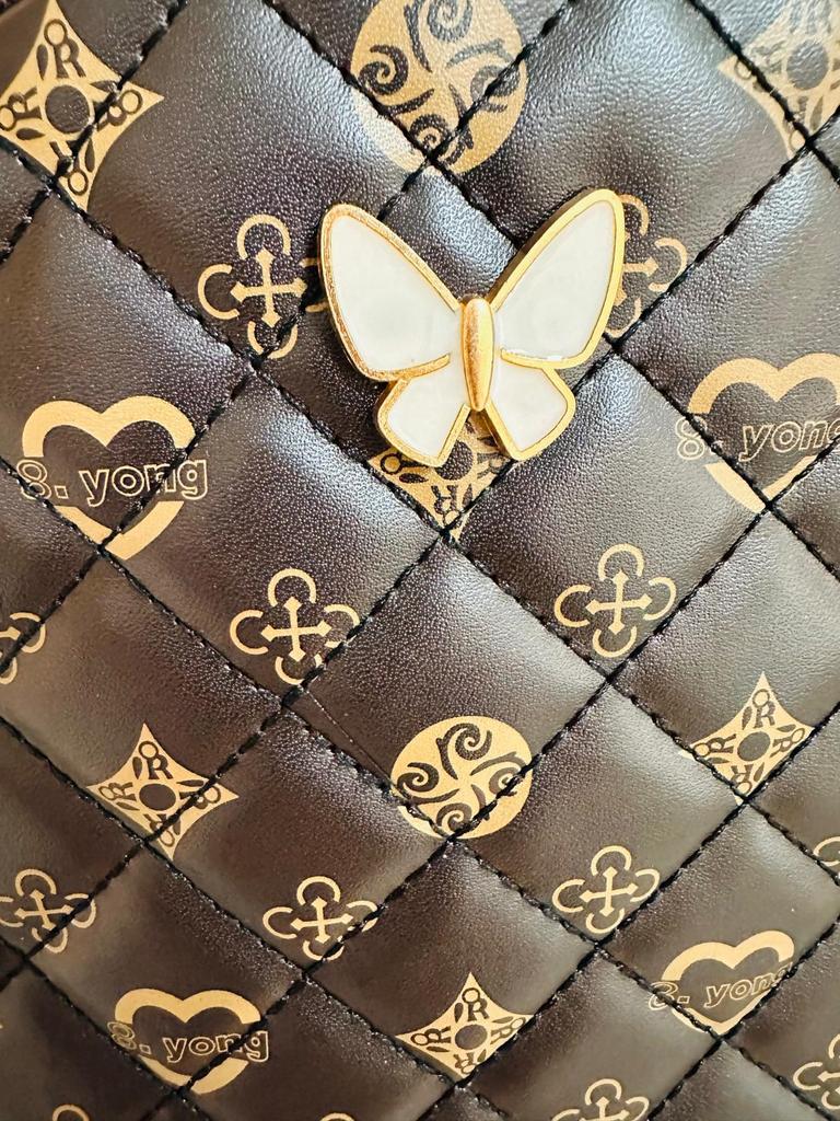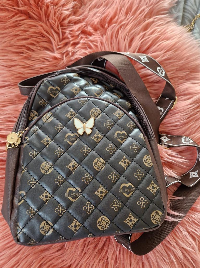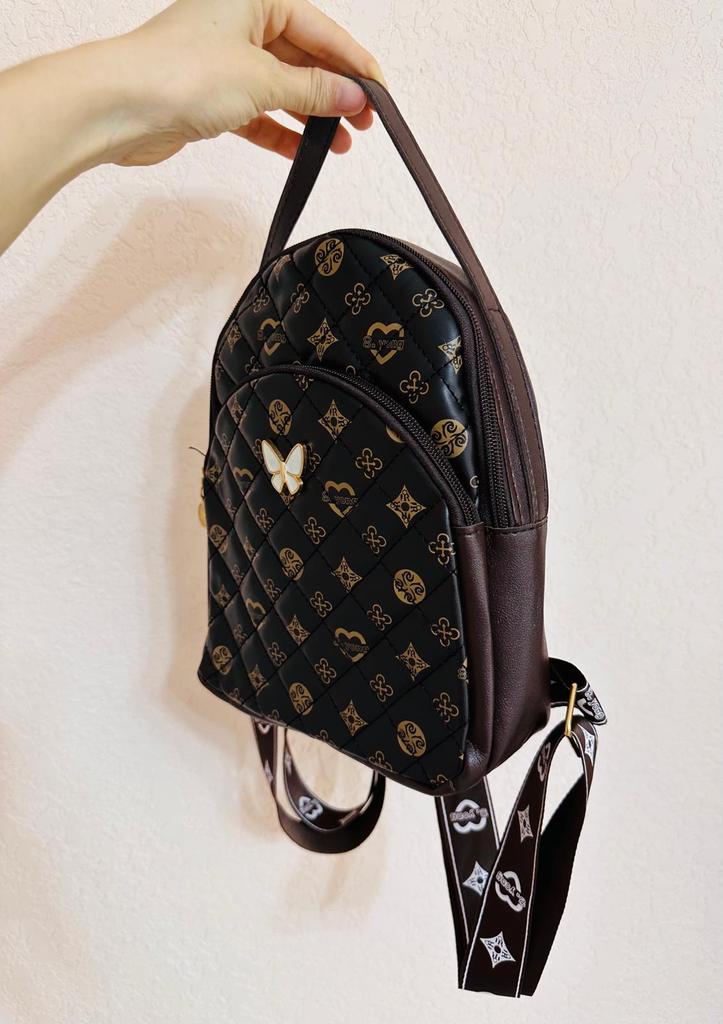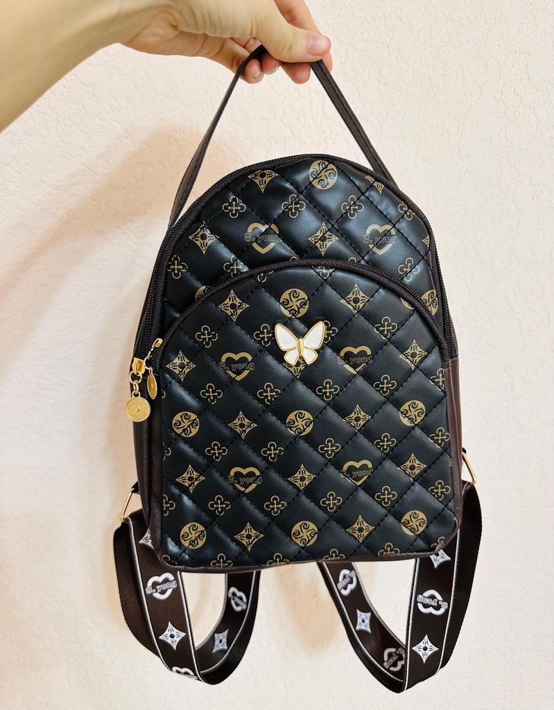 Симпатичный рюкзак. Выглядит очень даже прилично, несмотря на небольшую цену. Вполне объемный такой рюкзачок, его размеры 25х20 см. И выглядит аккуратно, и поместится все, что нужно. К тому же, рюкзак очень лёгкий. Цвет я выбрала самый простой, черный. Подойдёт подо все, и носить можно и зимой, и летом. Рюкзак стёганый. На черном фоне серые монограммы. На передней части большой карман, закрывающийся на молнию. Застёгивается рюкзак на молнию, внутри одно отделение. Подкладка атласная, черная. Ремни в цвет рюкзака, черные, тоже с монограммами. . Они регулируются. В качестве украшения - металлическая бабочка. Вся фурнитура красивого золотого цвета.
