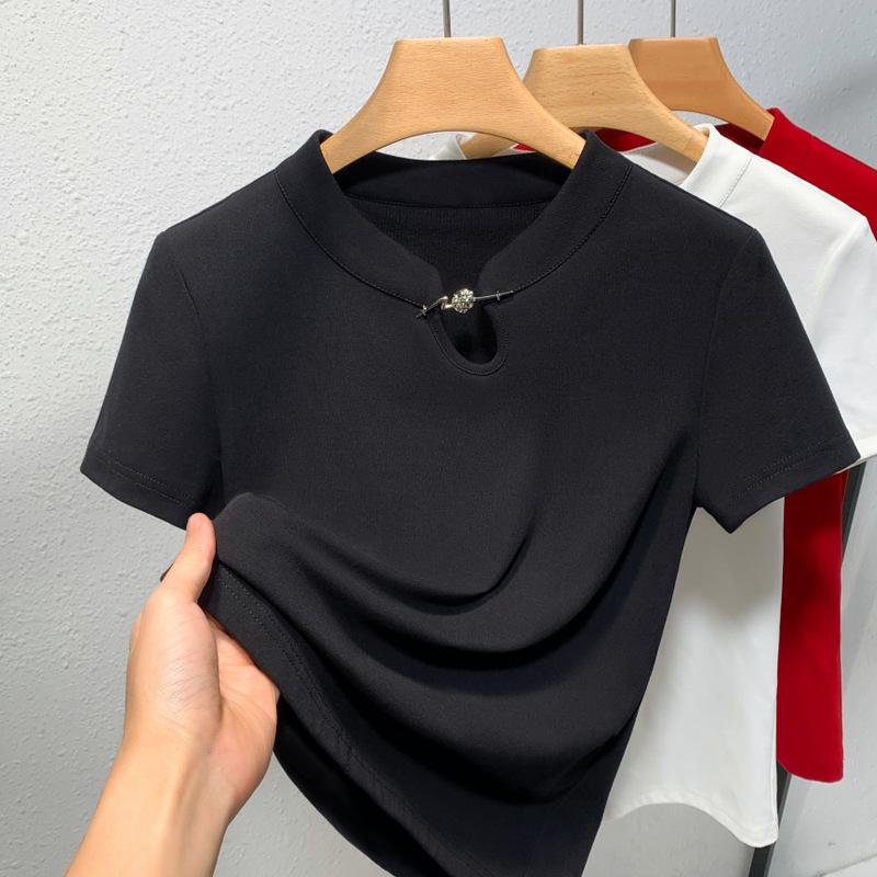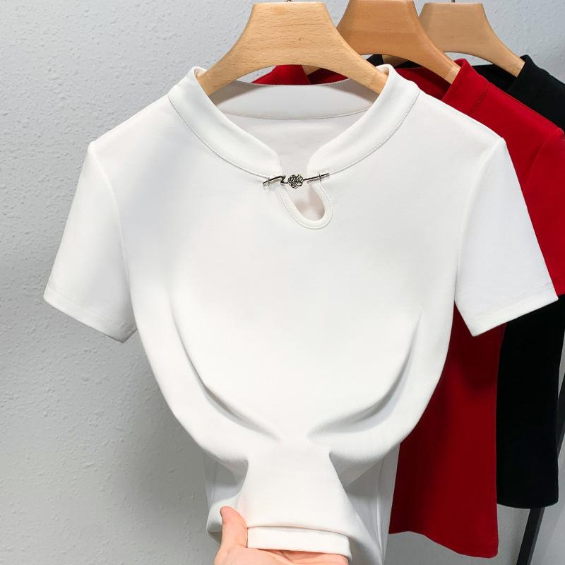 Футболка с короткими рукавами и воротником-стойкой. Новая женская одежда. Новая китайская однотонная хлопковая футболка с застежкой на пуговицы.