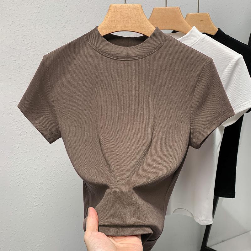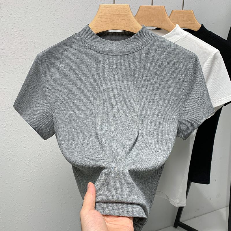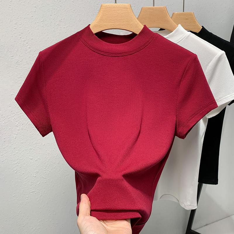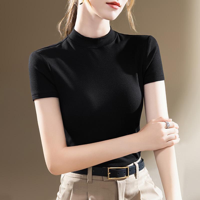 Футболка с короткими рукавами, женская новая женская одежда, стильная однотонная футболка с воротником-стойкой, нижняя часть рубашки, эластичный пояс, внутренний верх