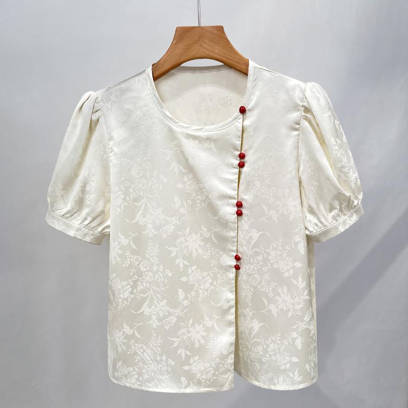Шифоновая рубашка с короткими рукавами и вырезом «сад» для женщин, новая женская жаккардовая рубашка в китайском стиле, топ с рукавами-фонариками, замедляющий старение