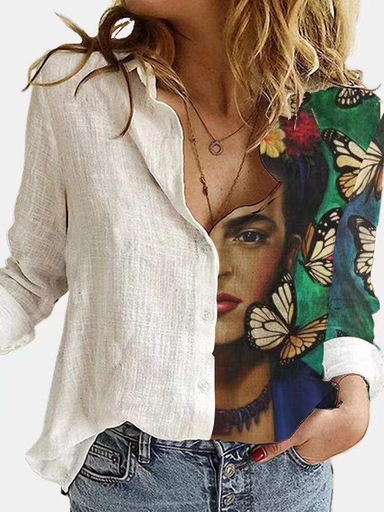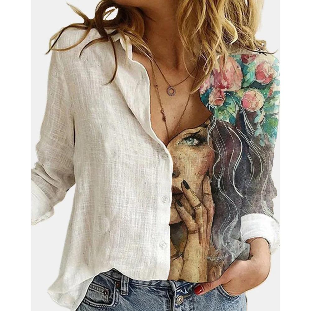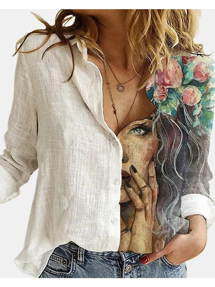 Модная вышивка ретро-принт с принтом лица, блузка с длинным рукавом, женская повседневная рубашка с лацканами и пуговицами