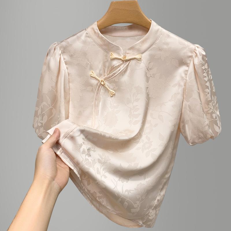 Новая футболка в китайском стиле с застежкой на пуговицы и наклонной планкой, с короткими рукавами и рукавами-фонариками в китайском стиле, женская рубашка с передним плечом