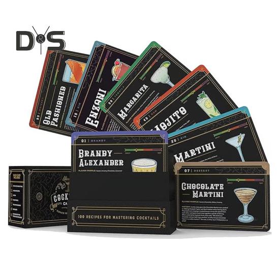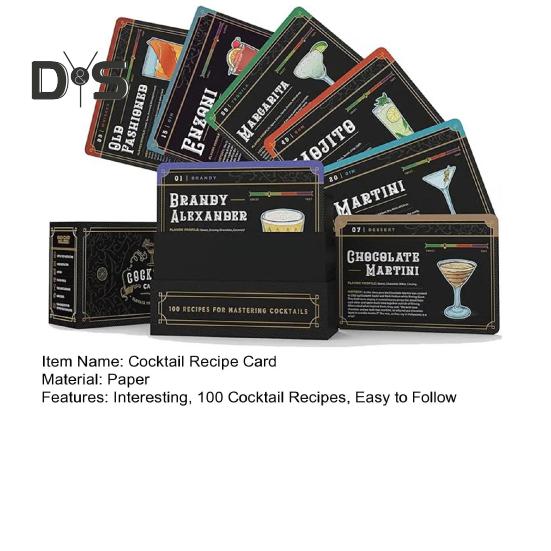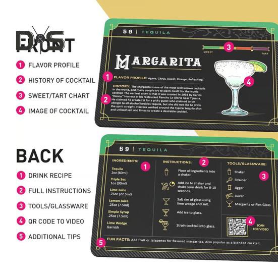 Наши коктейльные карточки, изготовленные из высококачественных материалов, отличаются яркими цветами и исключительной долговечностью, что гарантирует их яркость и разборчивость на протяжении бесчисленных сеансов смешивания.. Попрощайтесь с выцветающими отпечатками и поприветствуйте надежного спутника в вашем путешествии по миксологии.