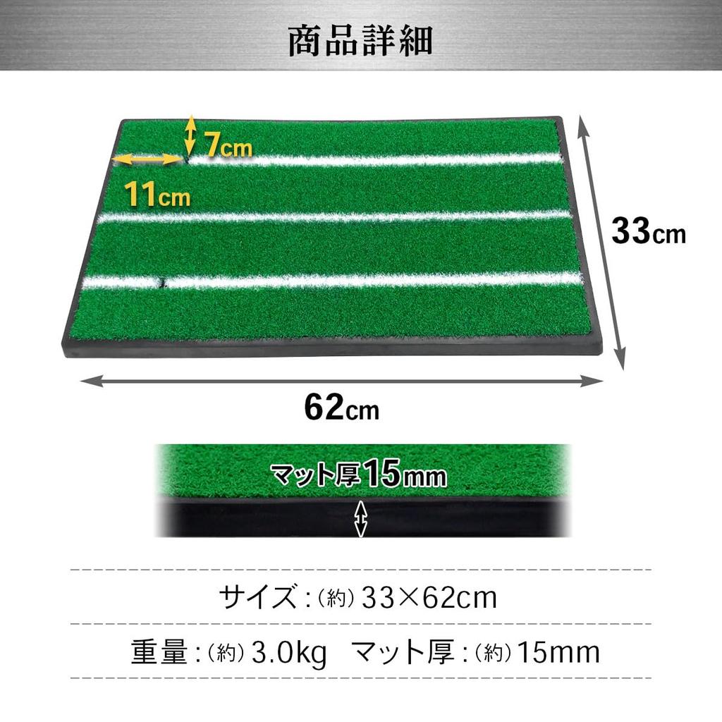[Резиновый коврик, который не скользит] В качестве основания используется резиновый коврик, который не сдвинется, даже если вы ударите со всей силы.. Если вы используете обычный коврик из ЭВА или SBR, он сдвинется в тот момент, когда вы сделаете снимок, и вам придется каждый раз возвращать его на место, но резиновый коврик тяжелый, поэтому его будет непросто сдвинуть! [Прочный искусственный газон из полипропилена] В травяной части используется искусственный газон из полипропилена, который трудно изнашивать.. Он плотный и прочный, поэтому его можно использовать в течение длительного времени.. Реалистичное ощущение травы и мягкий эластичный коврик позволяют тренироваться так, как будто вы находитесь на настоящем поле для гольфа.. [С белыми линиями, которые позволяют легко контролировать траекторию замаха] Хорошо заметные белые линии, рекомендованные для новичков и тех, кто беспокоится о замахе. Имеется отверстие для ти, поэтому вы также можете использовать его для отработки ударов с драйва.. [Компактный размер для удобства использования] Компактный размер 33 x 62 см, что позволяет легко переносить и хранить.. Его можно использовать как в помещении, так и на открытом воздухе, поэтому вы можете спокойно практиковаться, не беспокоясь о пространстве.