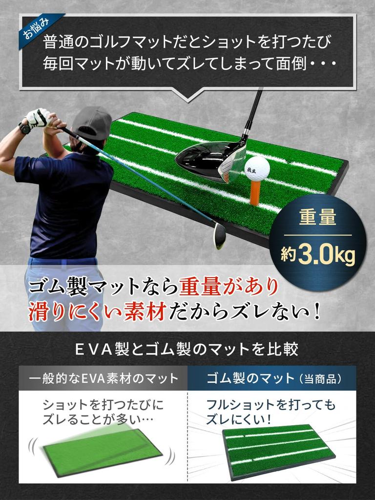 🏌 [Резиновый коврик, который не скользит] В качестве основания используется резиновый коврик, который не сдвинется, даже если вы ударите со всей силы.. Если вы используете обычный коврик из ЭВА или SBR, он сдвинется в тот момент, когда вы сделаете снимок, и вам придется каждый раз возвращать его на место, но резиновый коврик тяжелый, поэтому его будет непросто сдвинуть!