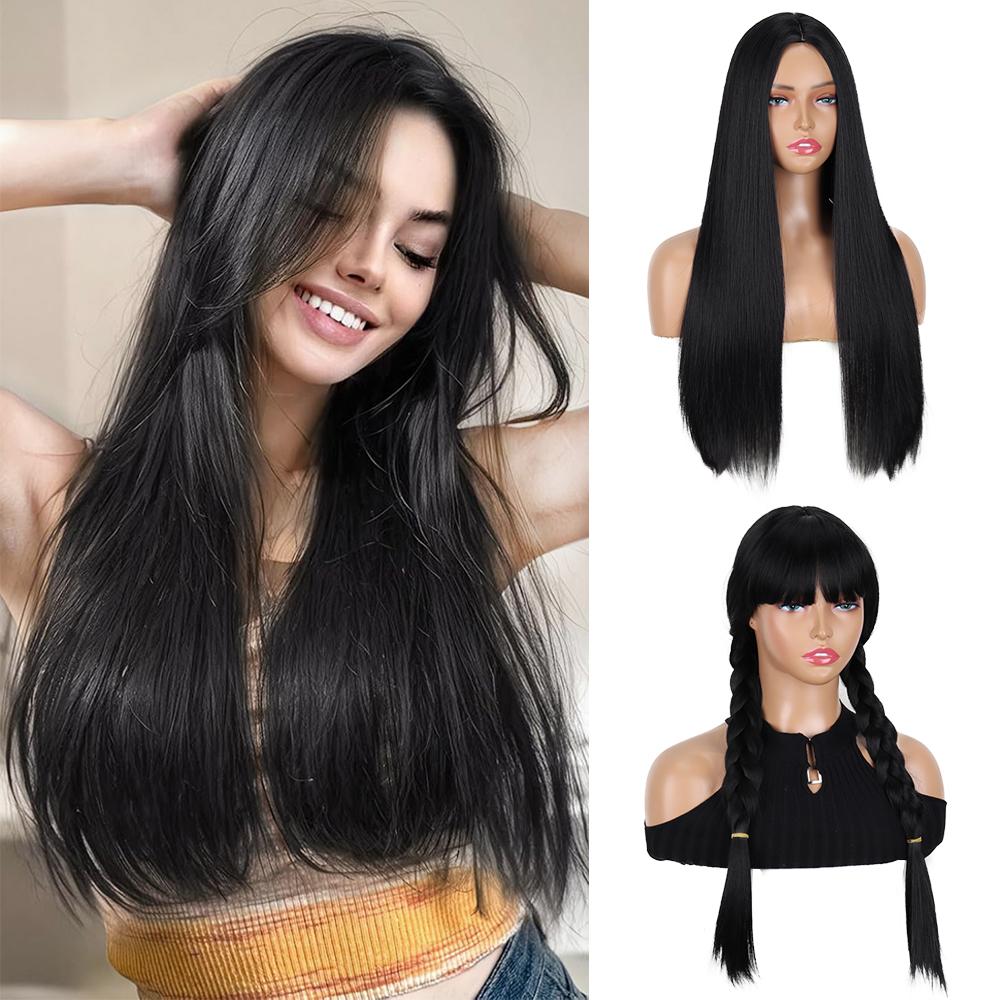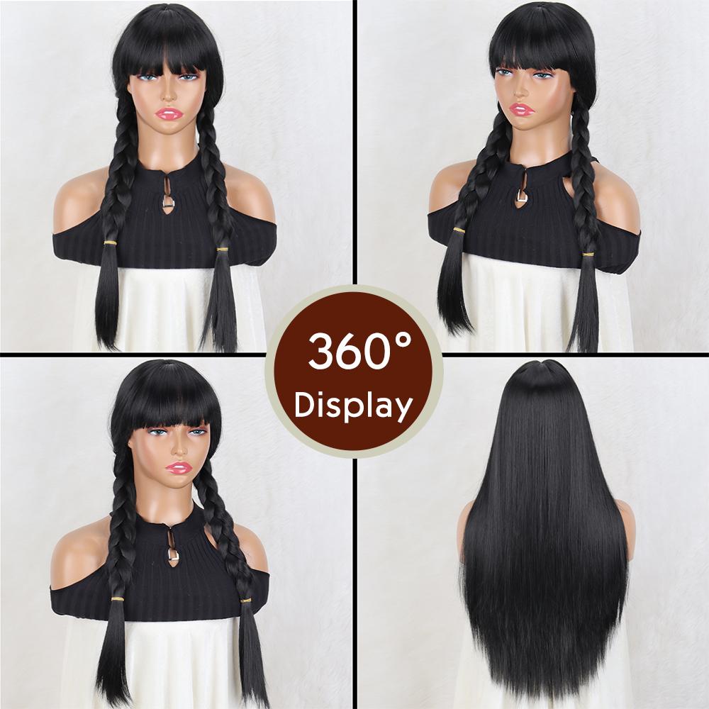 Синтетический длинный прямой черный парик с двойной косой, термостойкие волосы для женщин, для повседневного использования в косплее