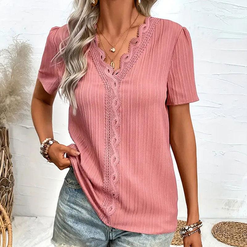Женская однотонная рубашка с жаккардовым вырезом и v-образным вырезом и кружевными рукавами с короткими рукавами