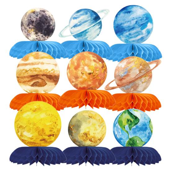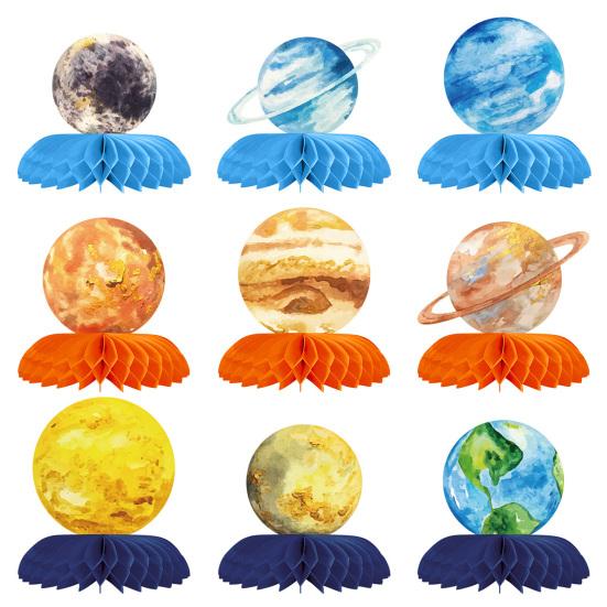 Полный набор из 9 украшений: В каждый набор входит 9 украшений в виде сот планет, каждое из которых демонстрирует уникальные и захватывающие элементы.. Создайте завораживающую космическую атмосферу с помощью этих украшений для стола, которые обещают создать потрясающие визуальные впечатления на каждом мероприятии.