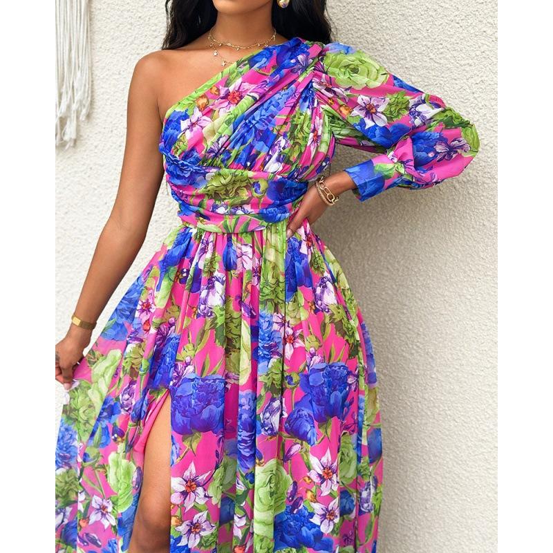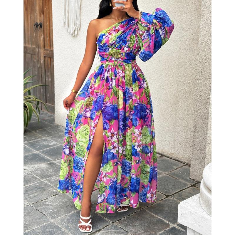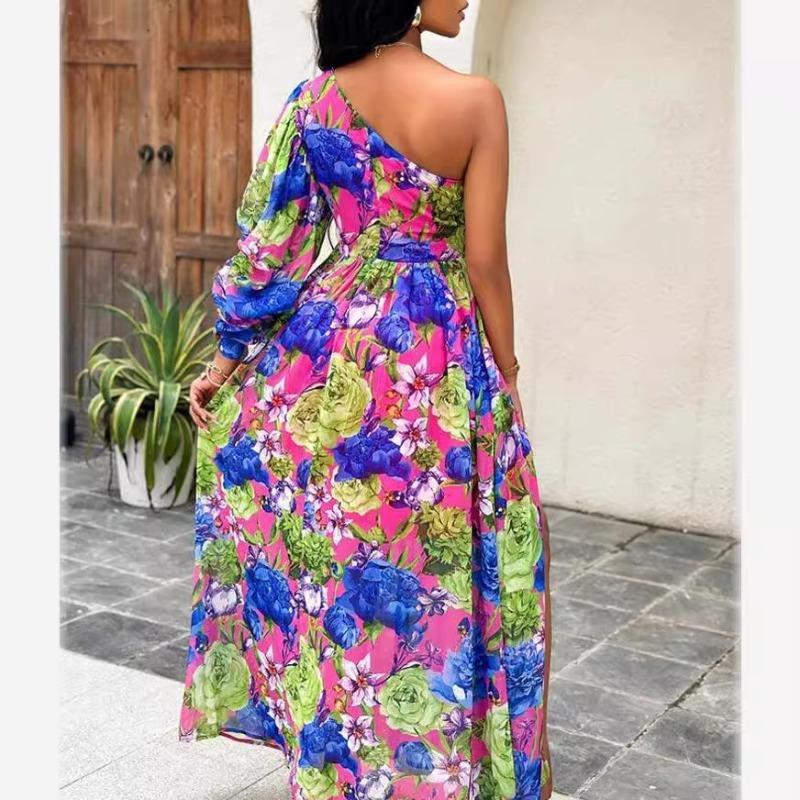 Женское летнее повседневное платье с открытыми плечами и длинными рукавами-фонариками с принтом