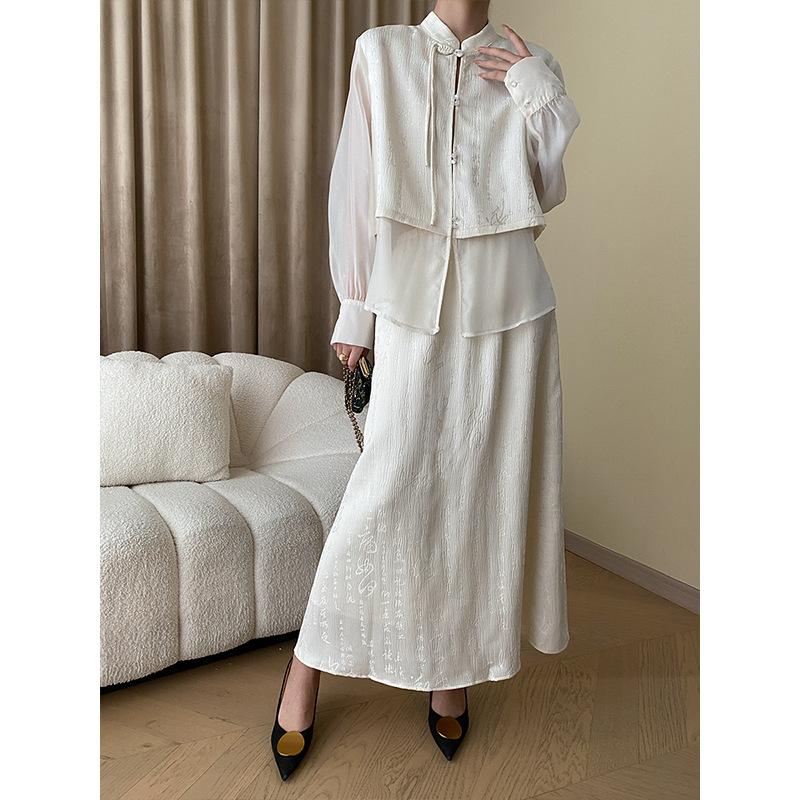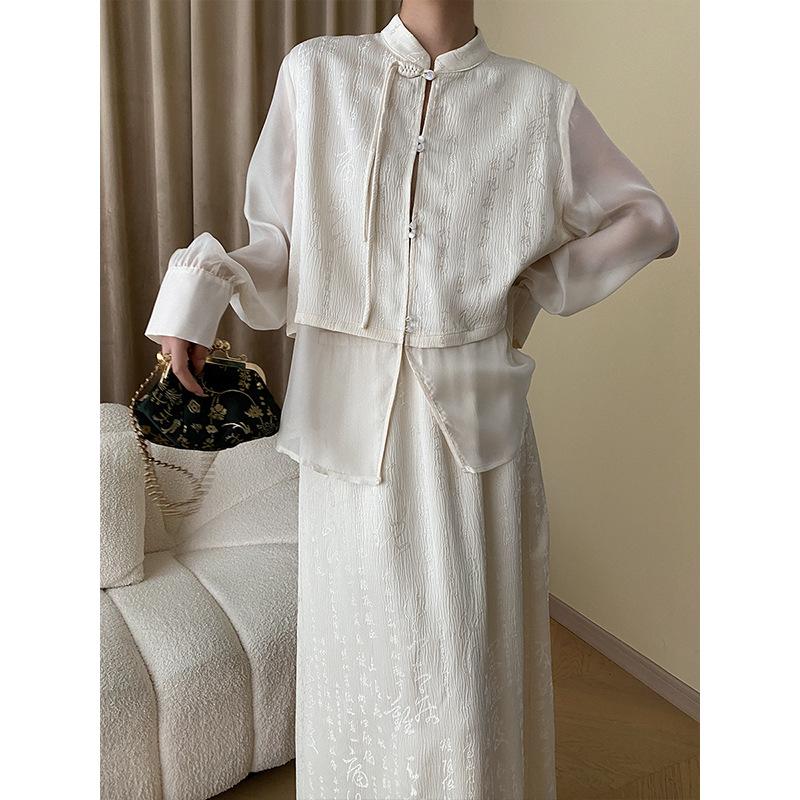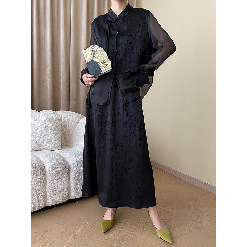Комплект из двух предметов: рубашка из темной ткани с покрытием на пуговицах в китайском стиле, юбка до половины тела