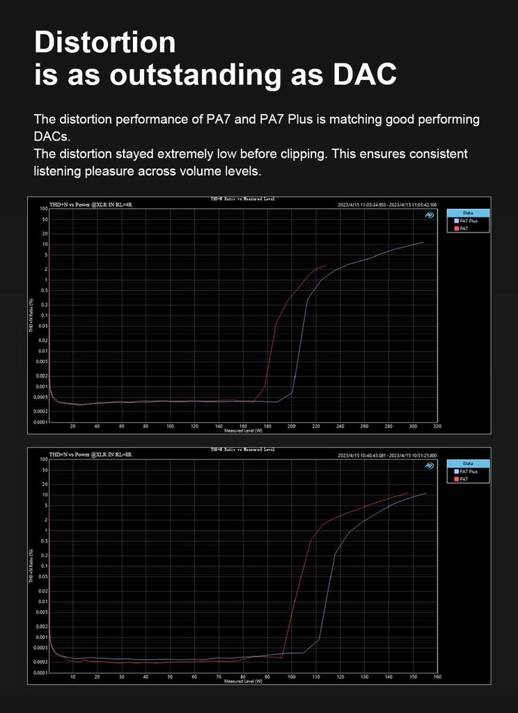 [Превосходные искажения на том же уровне, что и у ЦАП] Характеристики искажений TOPPING PA7 соответствуют характеристикам ЦАП с хорошими характеристиками. Уровень искажений остается крайне низким до клиппирования. Это гарантирует постоянное удовольствие от прослушивания независимо от уровня громкости.