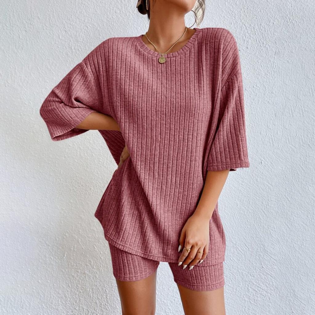 Женский модный повседневный однотонный свободный круглый вырез с коротким рукавом шорты костюм