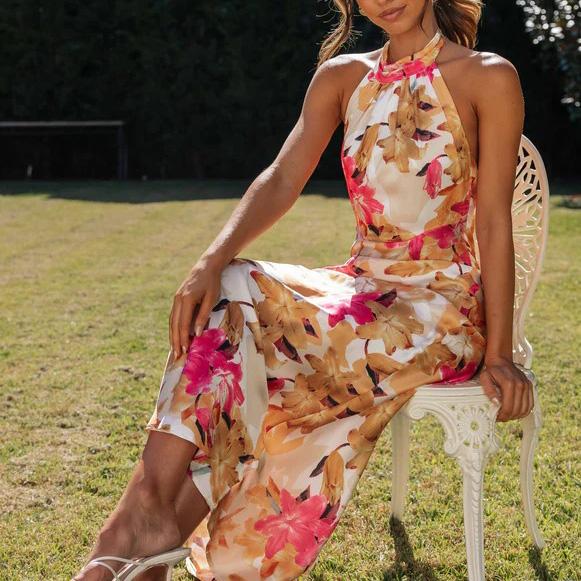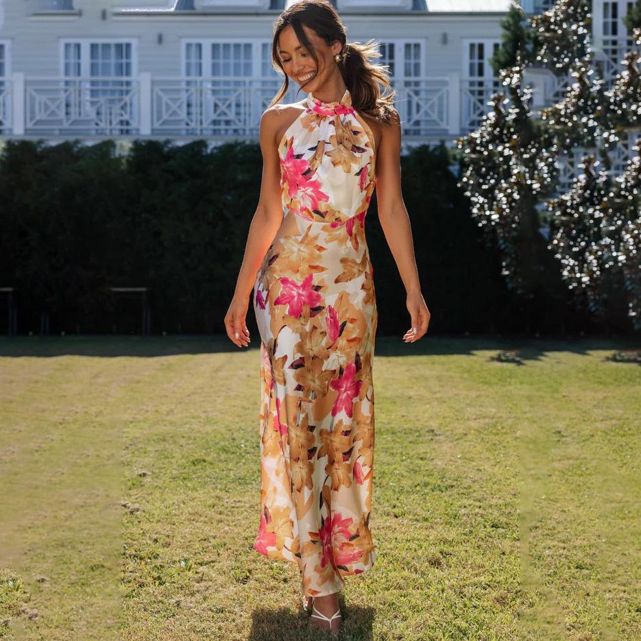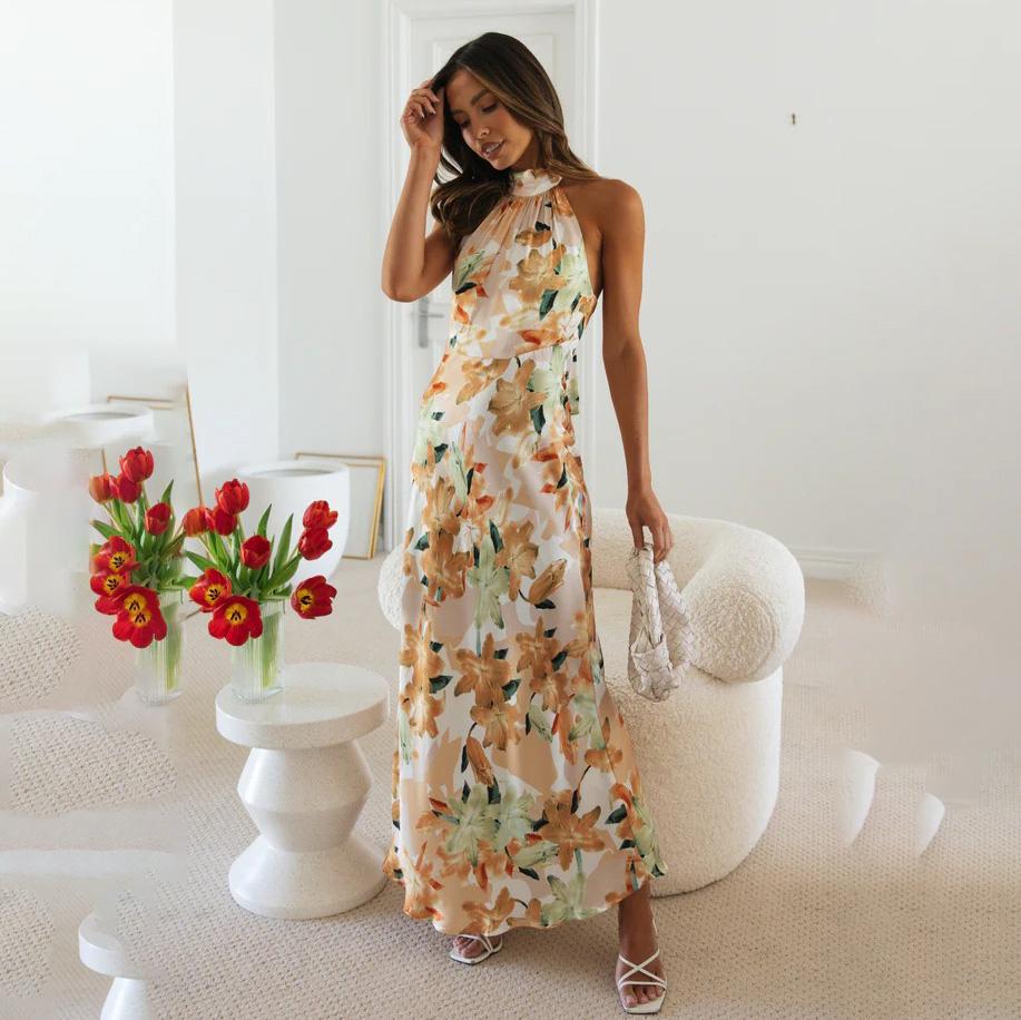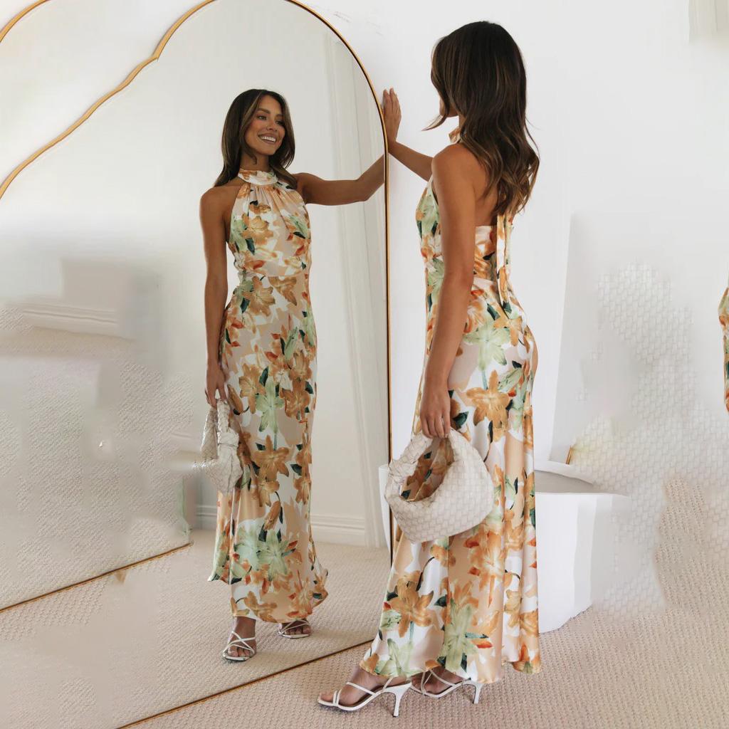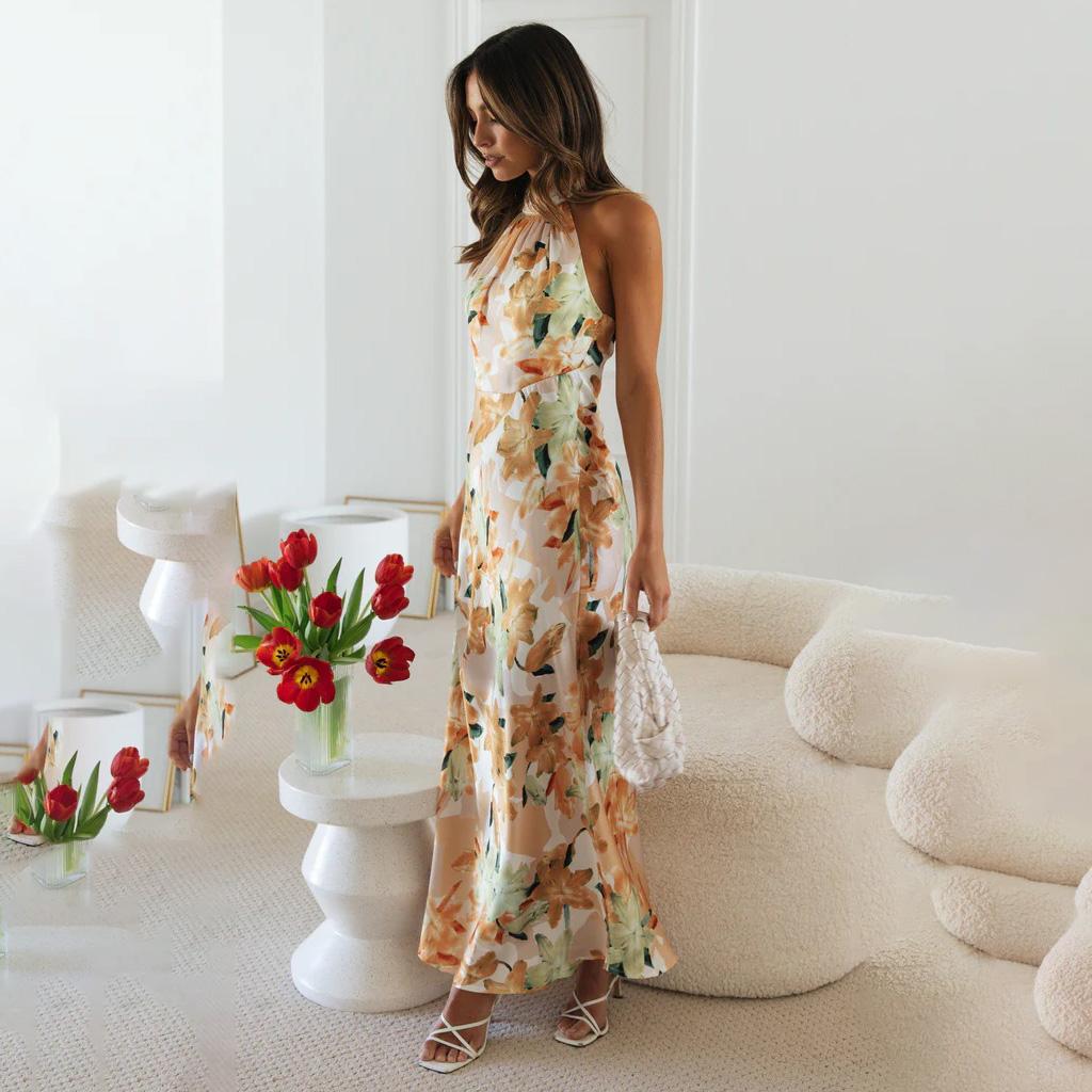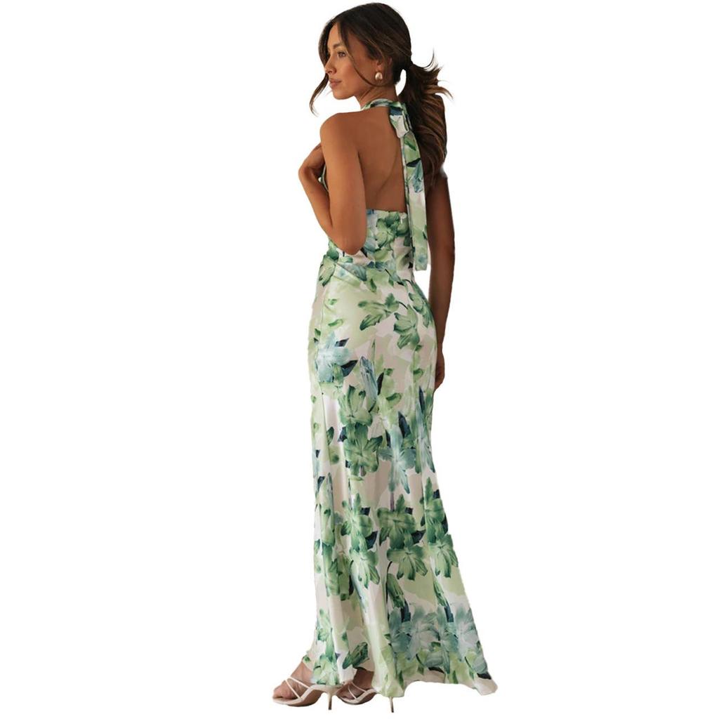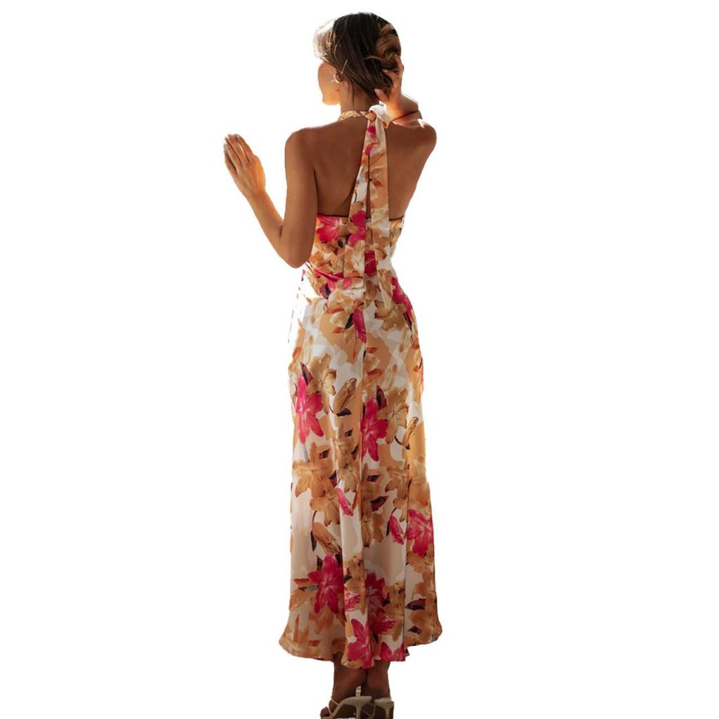 Женское весеннее платье без рукавов с цветочным принтом, летнее повседневное платье А-силуэта с открытой спиной и высокой талией, длинное платье со шнуровкой, размер S-XL
