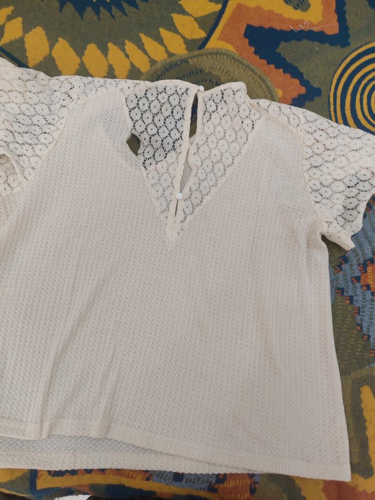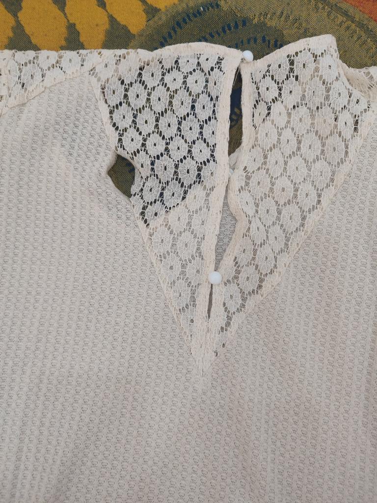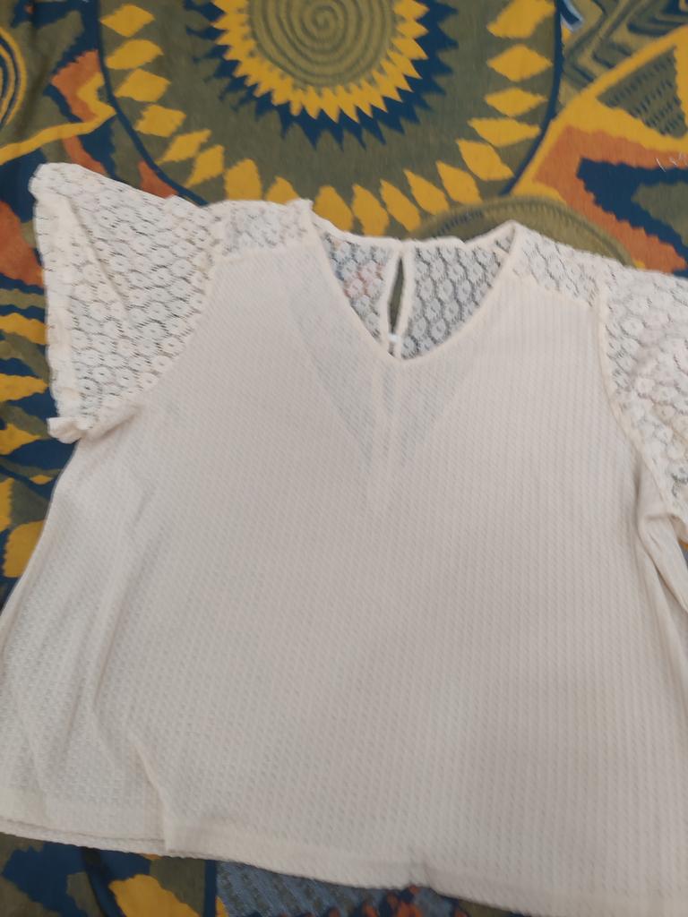Задумка хорошая, но фото ожидание/реальность)). Похода на тряпку, тонкая, цвет правда, как на фото. Пуговицы сзади ярко белые, сама беж светлый. Думала, она как летний тонкий джемпер из тонкого трикотажа, а она как футболка, и кружево дешевое болтается. Выглядит широкой и короткой. По размеру на рос. 50 как раз, сидит без обтягов, можно не растенивая надевать. На рост 169 см пупок прикрывает. Денег таких не стоит совсем.