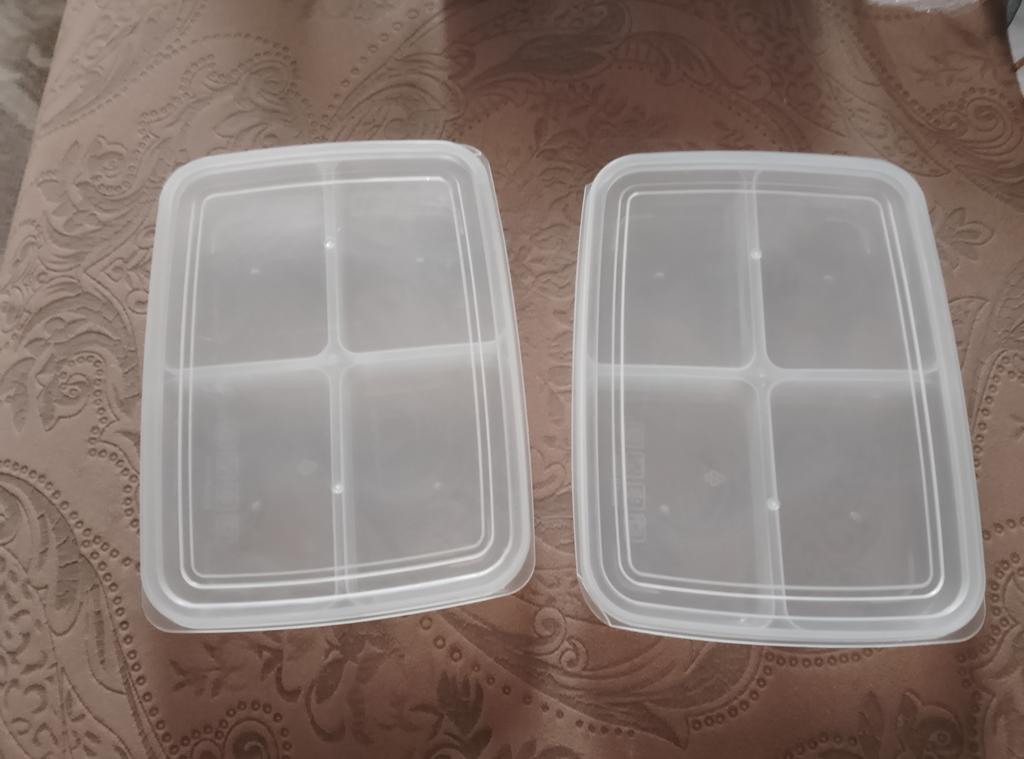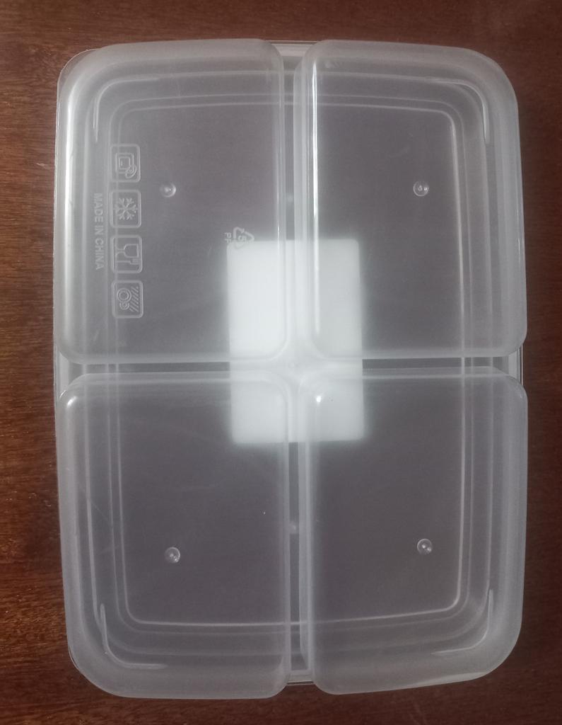 Лоток с четырьмя секциями 13х17.5см, каждая секция примерно 6х8.5см. Материал - пластик, высота 2.5см.