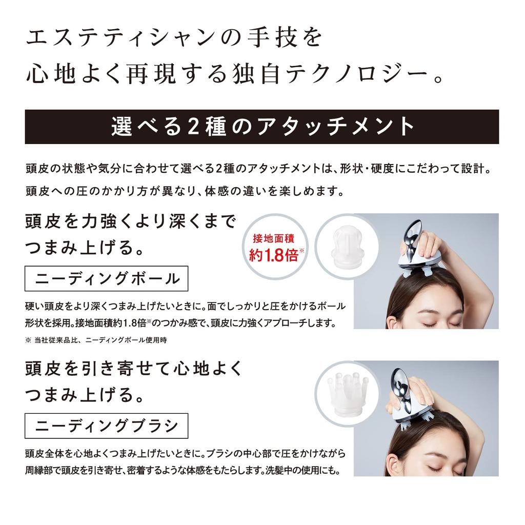 [Два типа насадок на выбор] Доступны два типа насадок на выбор в зависимости от состояния кожи головы и настроения, и они разработаны с учетом формы и жесткости.. Давление на кожу головы оказывается по-разному, и вы можете наслаждаться разными ощущениями.