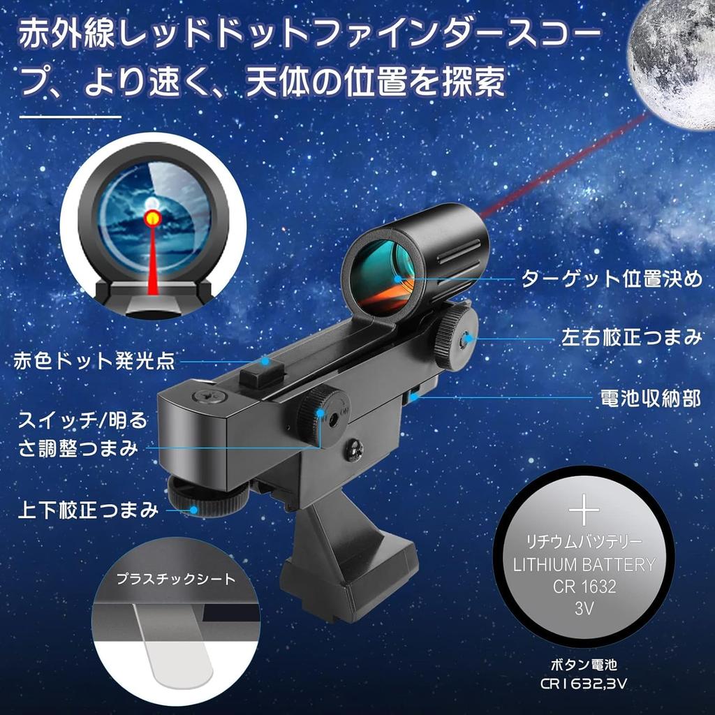 [Оптимальное увеличение и искатель с красной точкой] Телескоп для начинающих астрономов оснащен двумя сменными окулярами. (К25мм и К10мм) и одна 3-кратная линза Барлоу, а увеличение можно регулировать от 20x до 150x. Его можно использовать не только для наблюдения за планетами ночью, но и для наблюдения за природой, птицами, ландшафтами и т. д.. в течение дня. Прицел с красной точкой 5x24 позволяет легко находить цель, поворачивая ручку для регулировки направления.