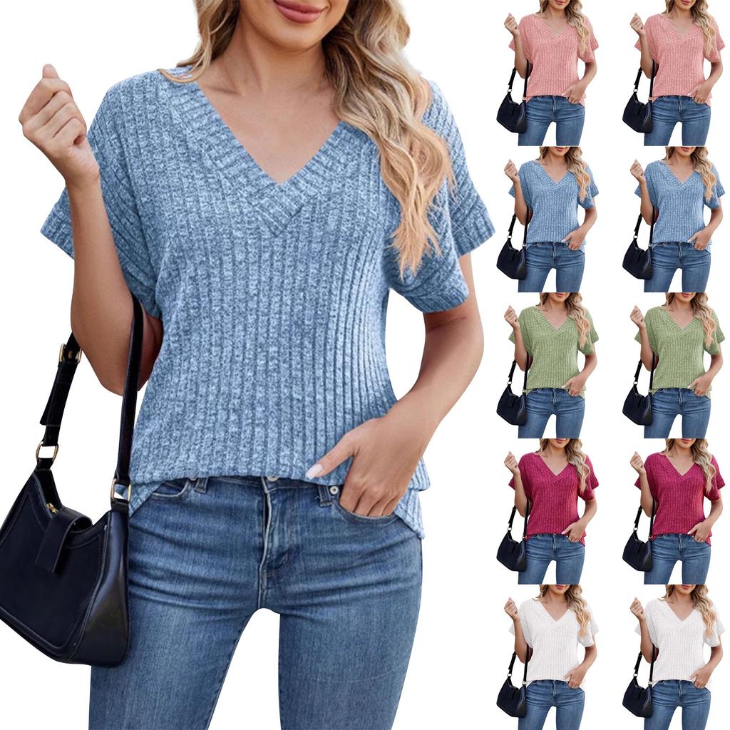 Женская мода повседневная футболка с коротким рукавом и V-образным вырезом, однотонная, базовая текстура — купить товар онлайн с бесплатной доставкой по всему миру!