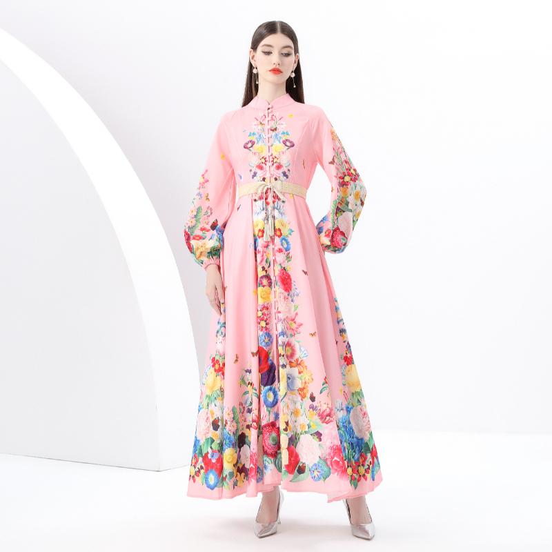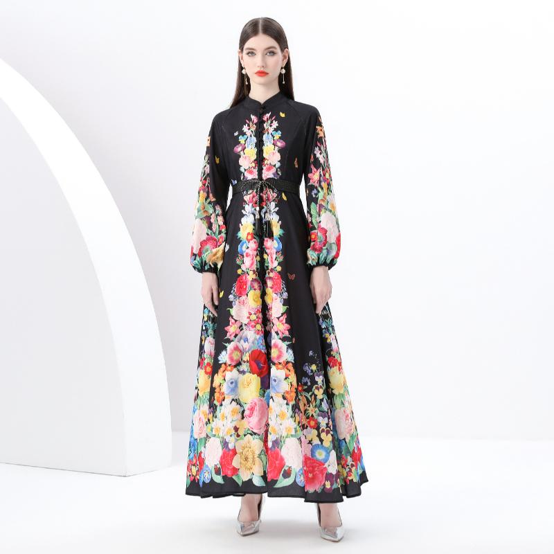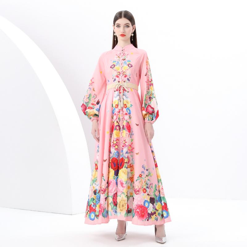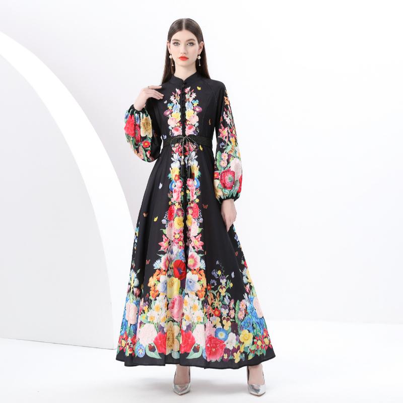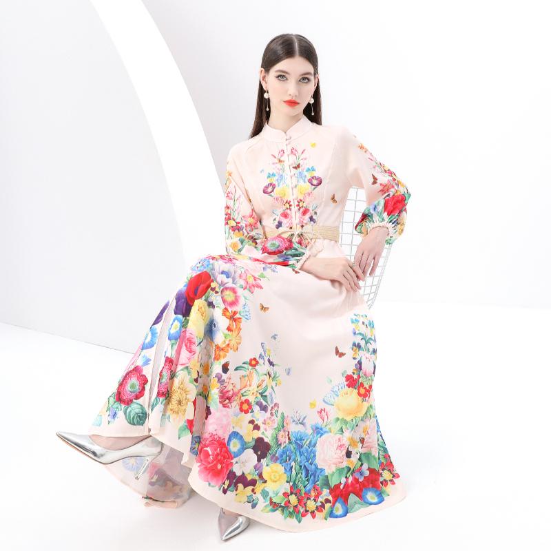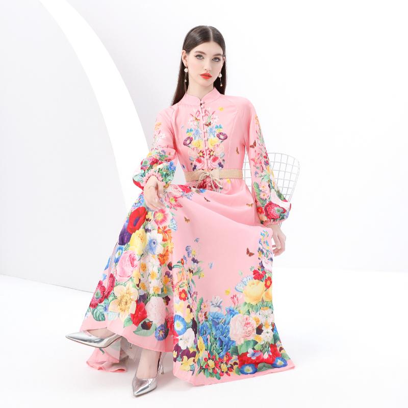 Весна-лето Женские однобортные длинные макси-платья для пляжа с поясом и принтом больших размеров