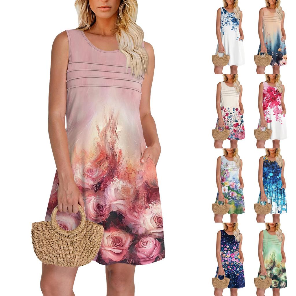 Характерная черта: Летние платья-майки для женщин поставляются с красочным цветочным принтом, повседневные платья с U-образным вырезом, платья-майки без рукавов, летние свободные платья с карманами для женщин, платья-футболки, повседневные женские пляжные платья.