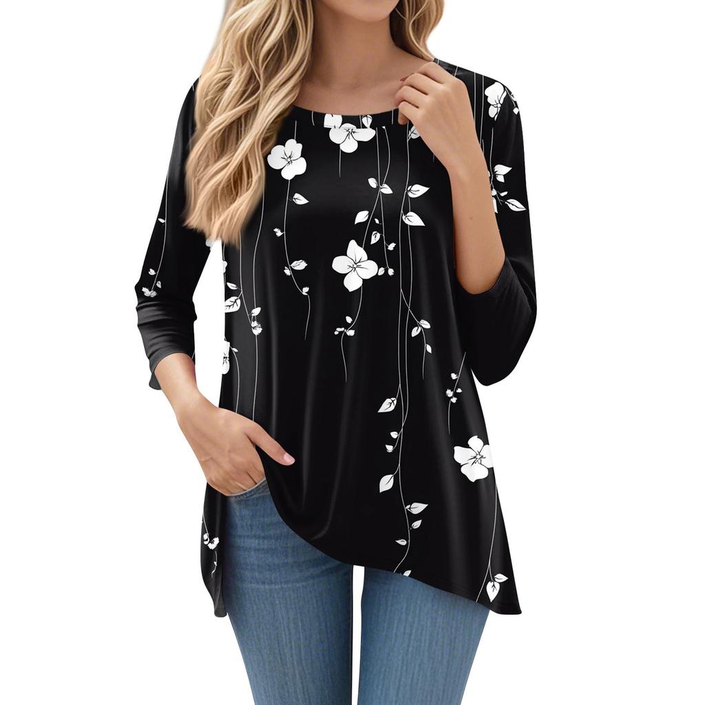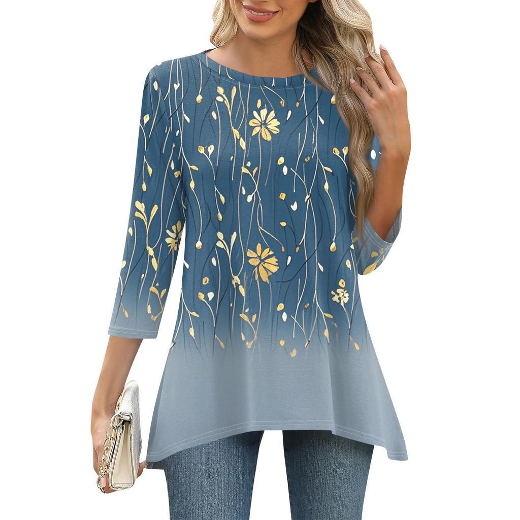 3/4 рукав туника топы для женщин принтованный повседневный выходной свободный крой модная базовая футболка с круглым вырезом