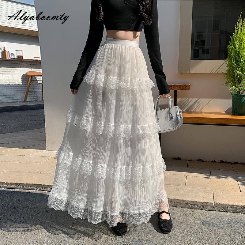 2025 Весна Лето Женская Макси Длинная Белая Юбка Высокая Талия Многослойные Оборки Юбка Принцессы Милые Романтичные Женские Кружевные Многоуровневые Юбки